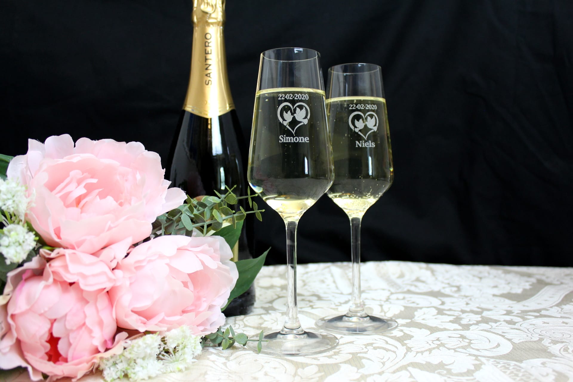 Fejr det specielle øjeblik med et sæt af to champagneglas, der er designet til at tilføje et personligt præg til bryllupsfejringen. Dette elegante sæt champagneglas med indgravering er perfekt til at markere det store øjeblik og gøre det endnu mere mindeværdigt. Hvert glas er smukt indgraveret med et romantisk motiv af turtelduer indkapslet i et hjerte, med parrets navne indgraveret under motivet og datoen for den særlige begivenhed over motivet.