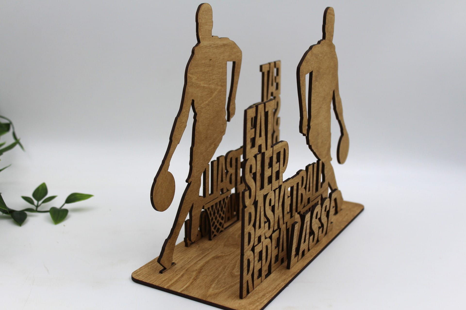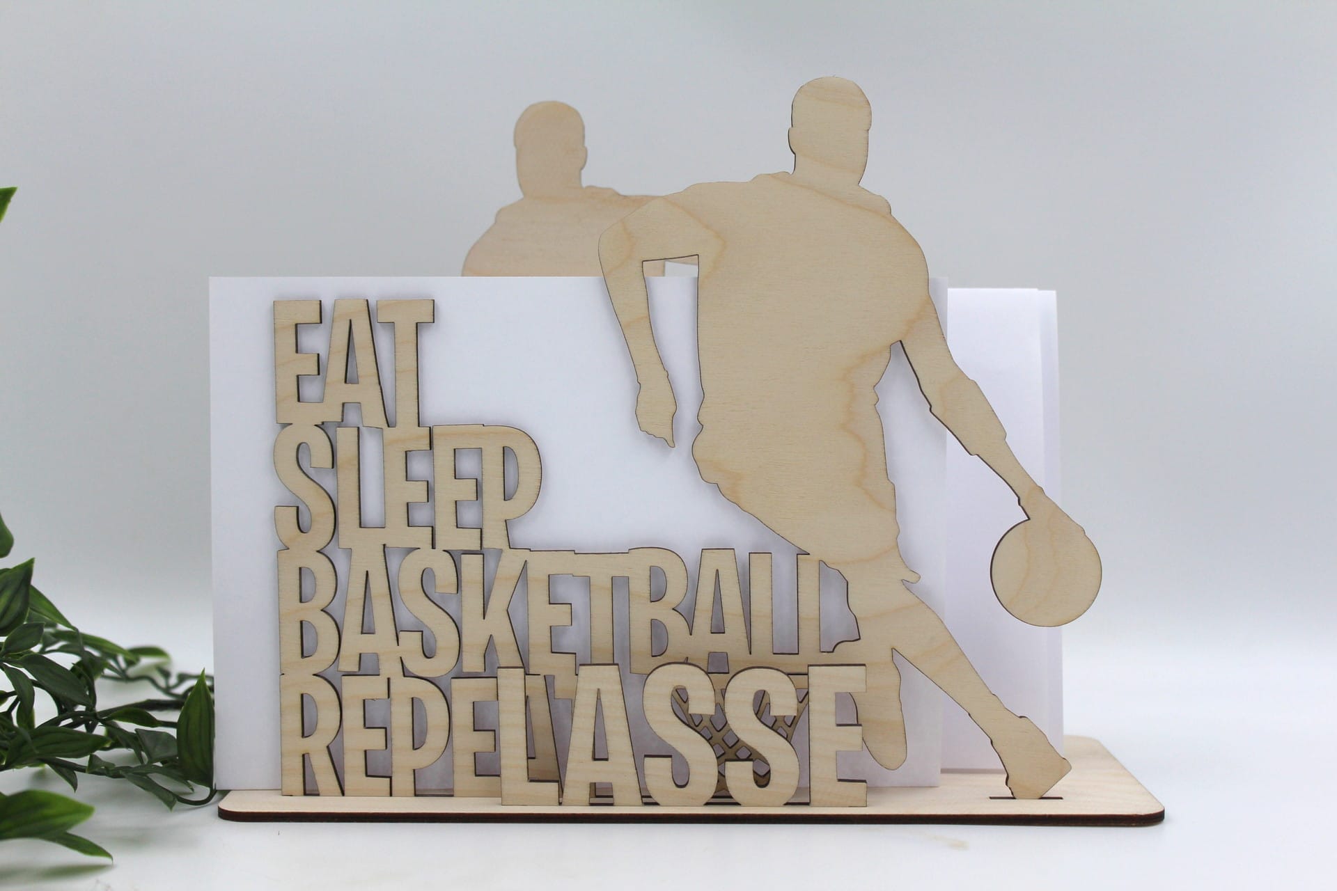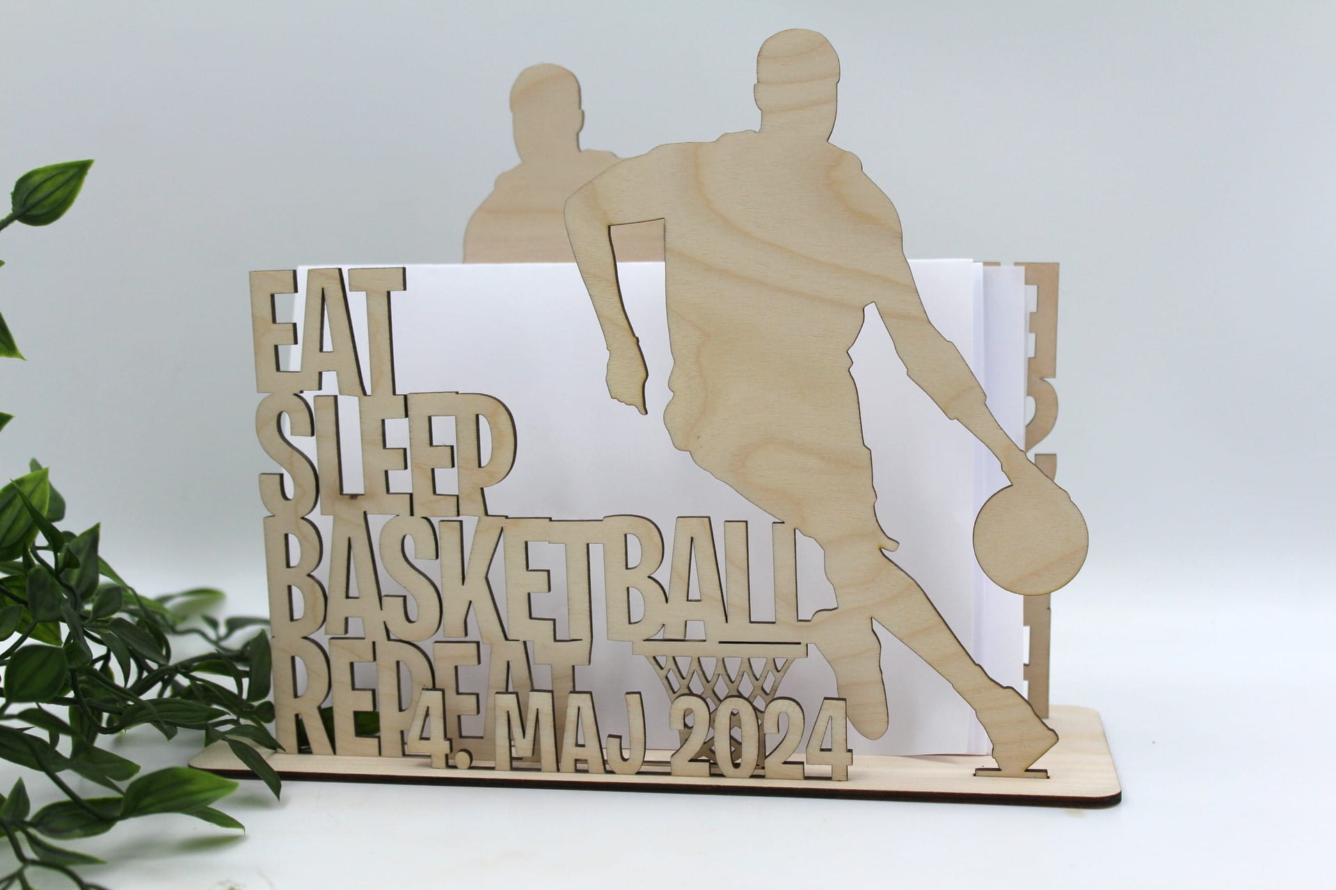 Vores sangskjuler i udskåret træ er skabt med kærlighed til detaljerne og præcision. Den imponerende basketballspiller og den inspirerende tekst “EAT, SLEEP, BASKETBALL, REPEAT” er præcisionslaserskåret for at give et unikt touch til din begivenhed.