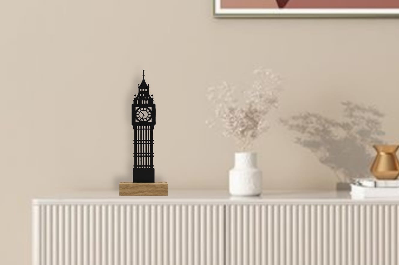 Vores silhuet af Big Ben er mere end bare en skulptur. Den er et kunstværk skabt med stolthed i Danmark, der kombinerer nordisk minimalisme med æstetisk appel. Denne moderne kunst til stuen er en manifestation af vores dedikation til høj kvalitet og unikt håndværk. Med sin silhuet og smukke egetræsfod er denne skulptur det perfekte eksempel på nordisk inspireret brugskunst.
