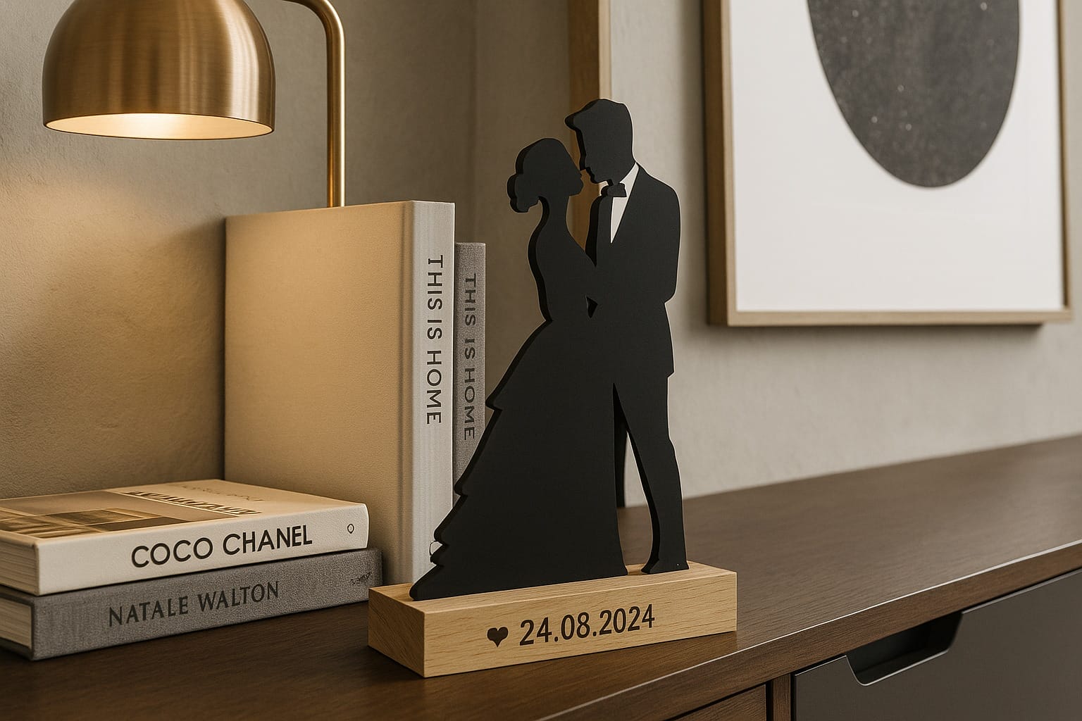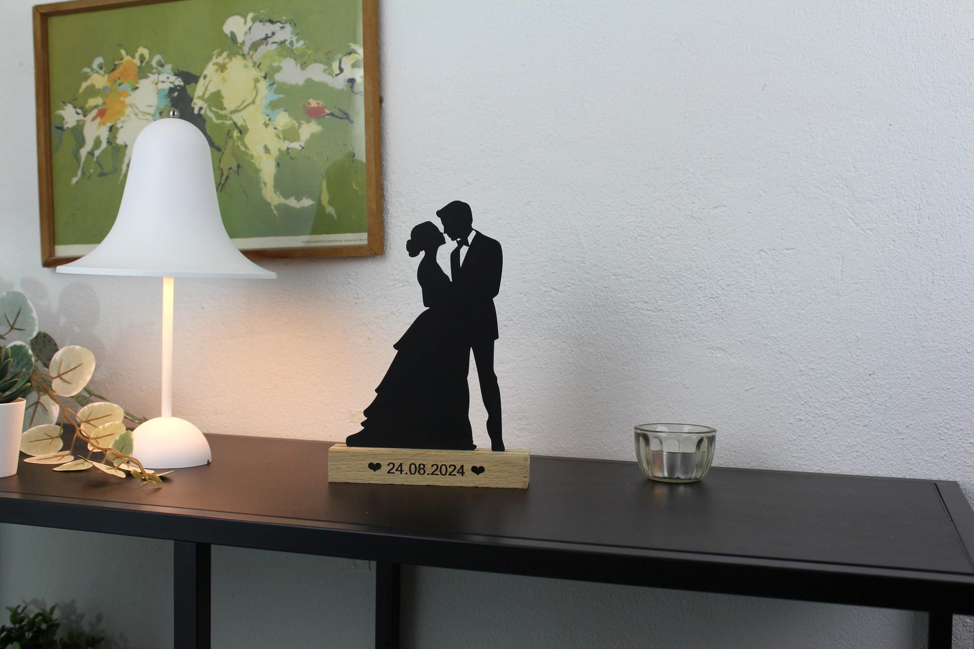 Med mulighed for personlig indgravering i træfoden – f.eks. navne eller en bryllupsdato – bliver dette kunstværk ikke bare et smukt indslag i hjemmet, men også en unik brugskunst med stor affektionsværdi.