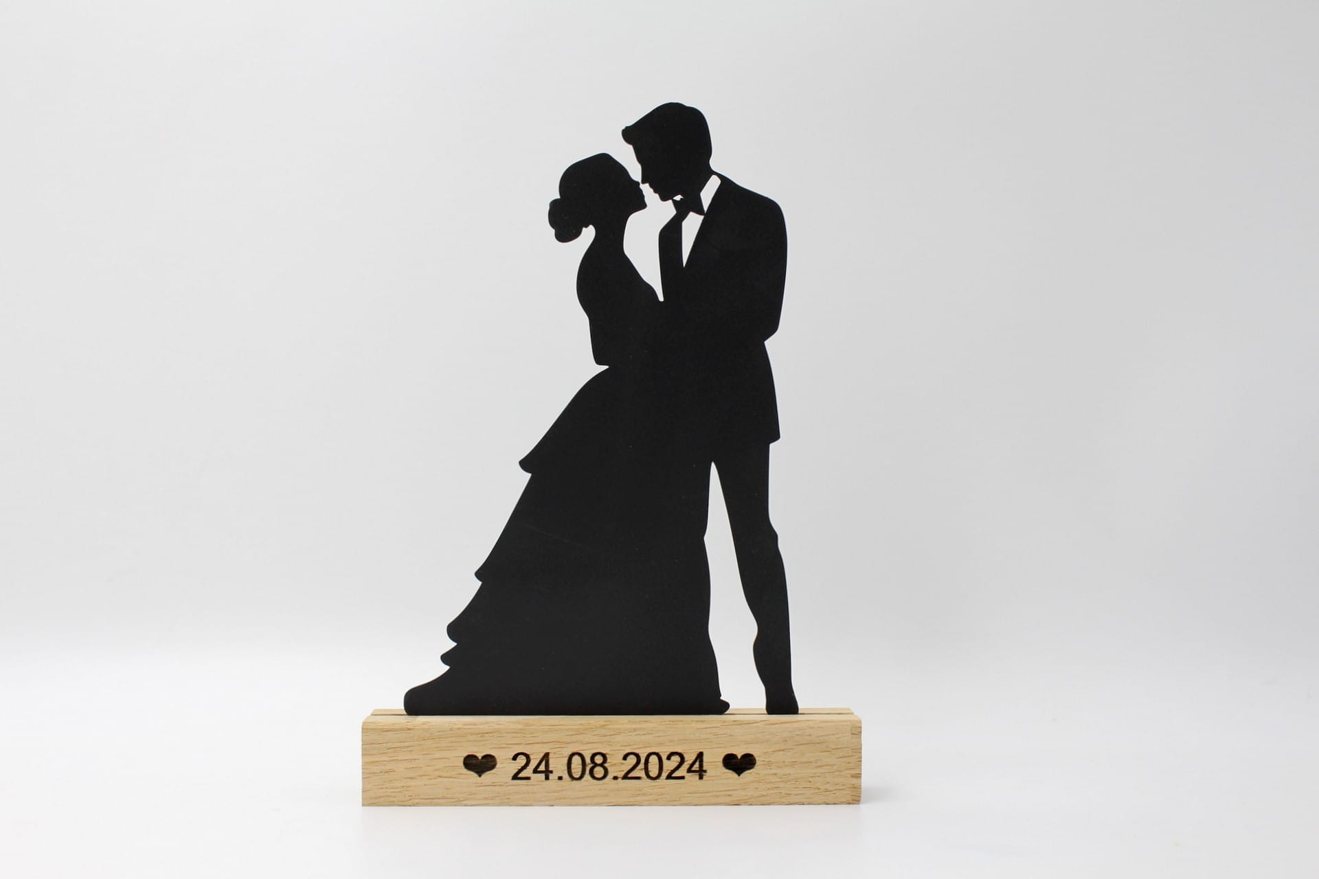 Denne smukke skulptur forestiller et stilrent brudepar, hvor bruden har håret smukt opsat – et symbol på kærlighed og fællesskab. Figuren er præcisions laserskåret i sortlakeret stål og står solidt plantet på en træfod i eg, hvilket skaber et stilrent udtryk, der passer perfekt ind i den nordisk inspirerede brugskunst. Det er moderne kunst med et romantisk twist – skabt til at pynte i stuen og minde om en helt særlig dag.