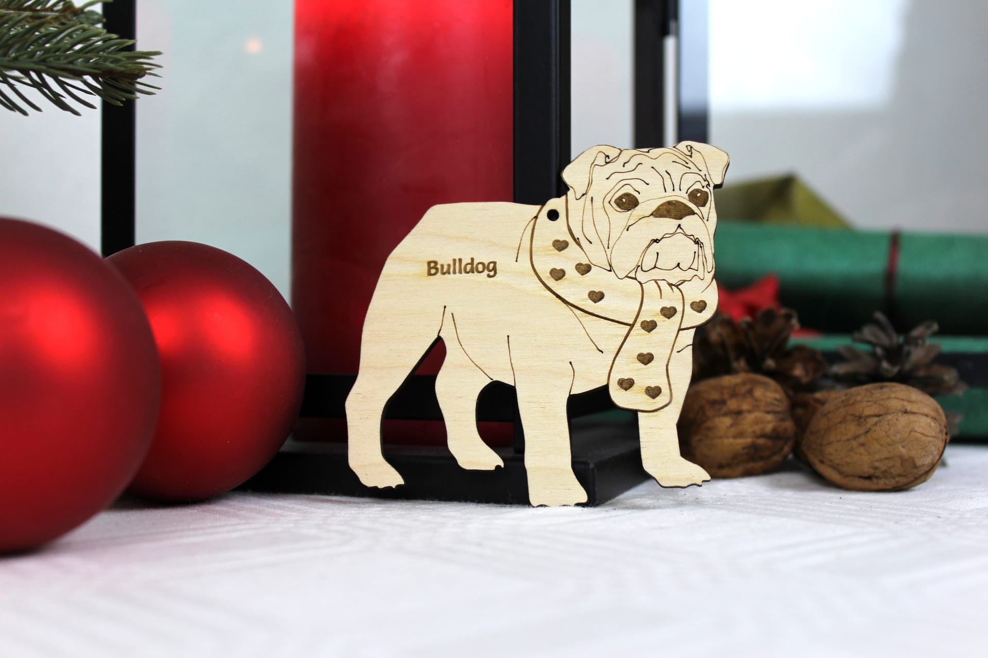 Sød Bulldog ophæng med bomuldsnor, så den kan hænge og pynte flot på juletræet eller dekorationen.