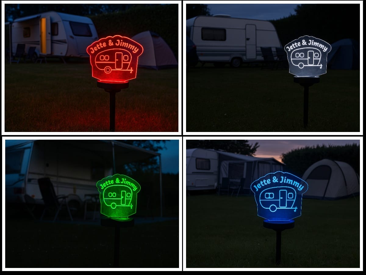 Personlig solcellelampe til camping – med navn og motiv af campingvogn
