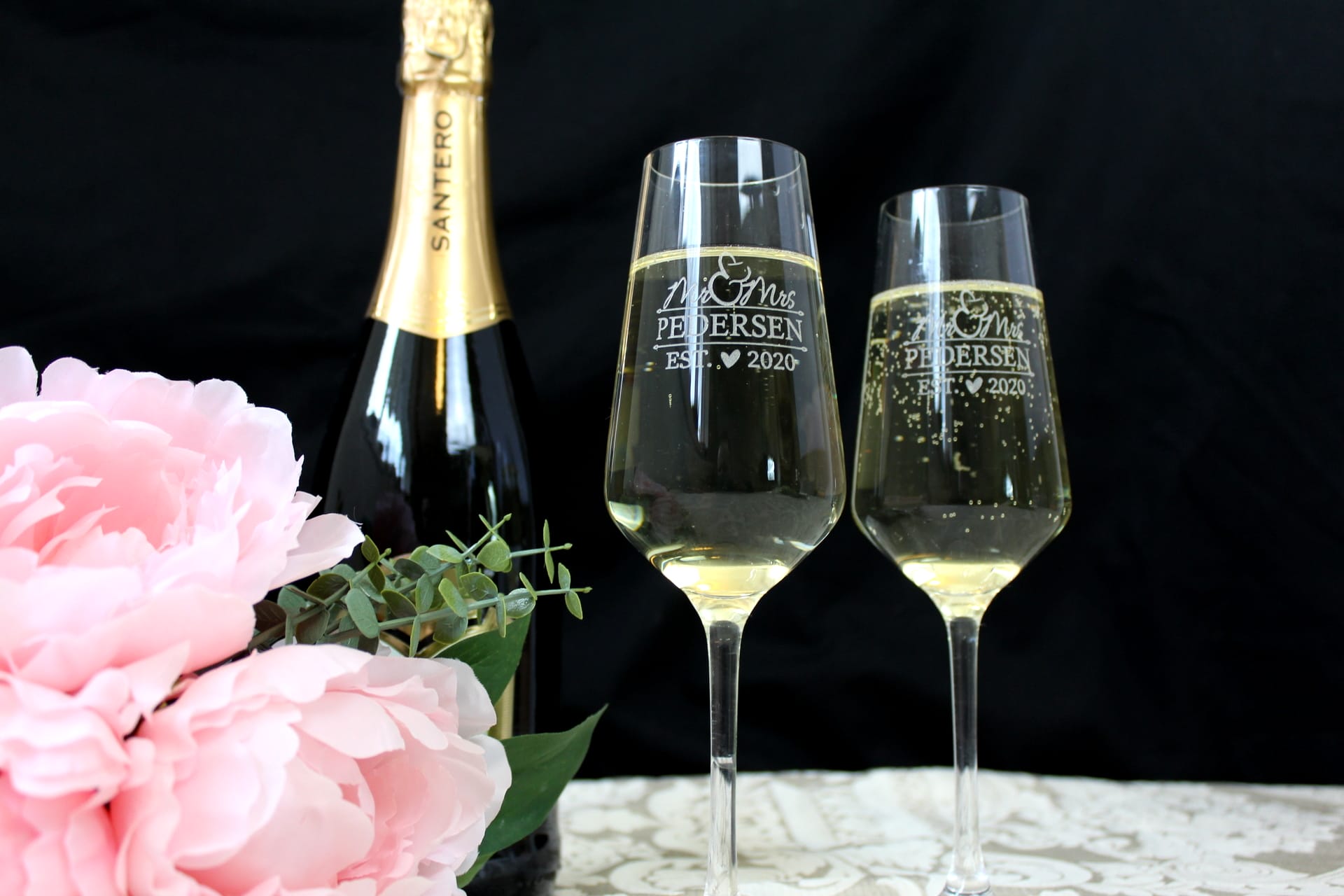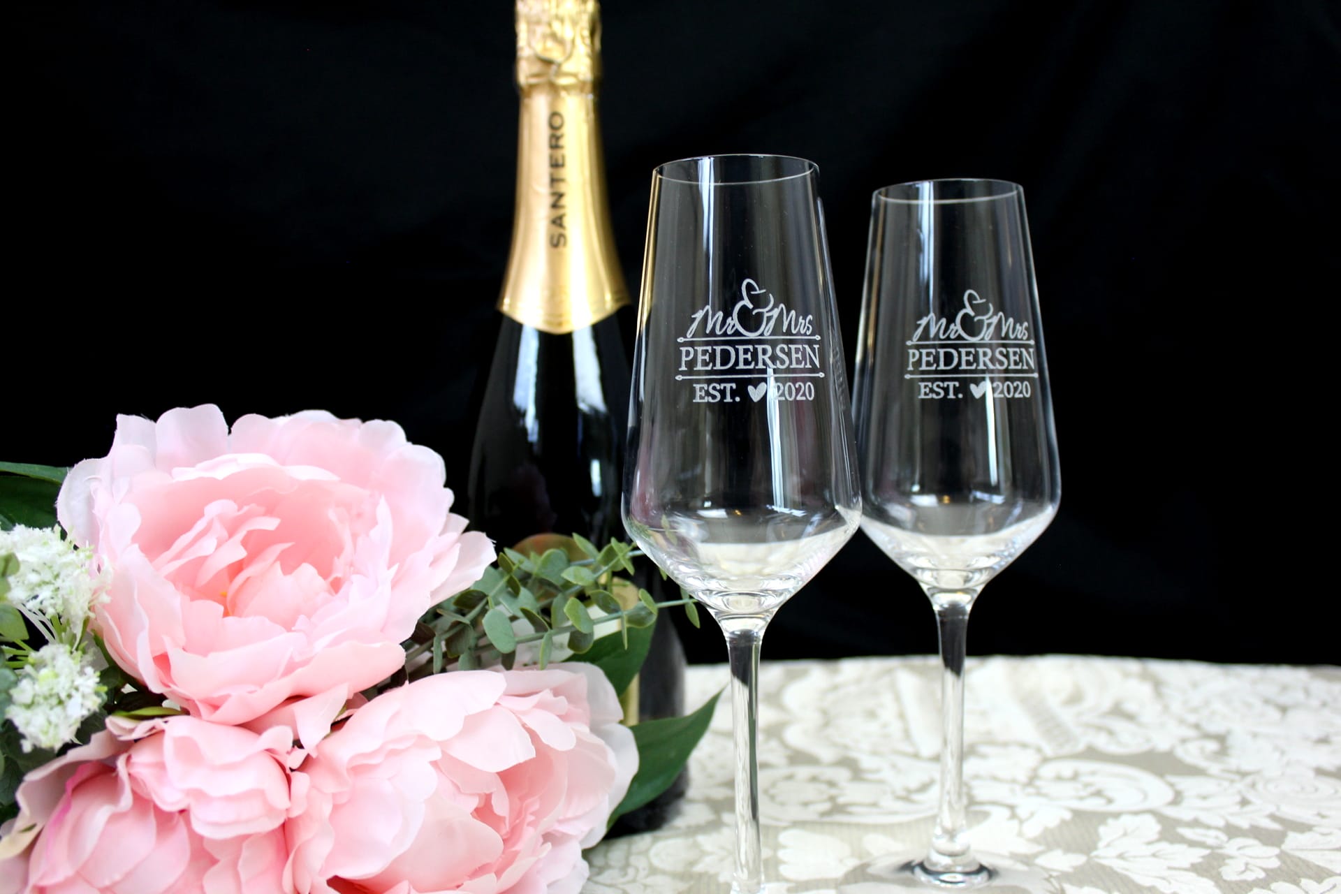 Elegante og smukke champagneglas med brudeparrets efternavn.
