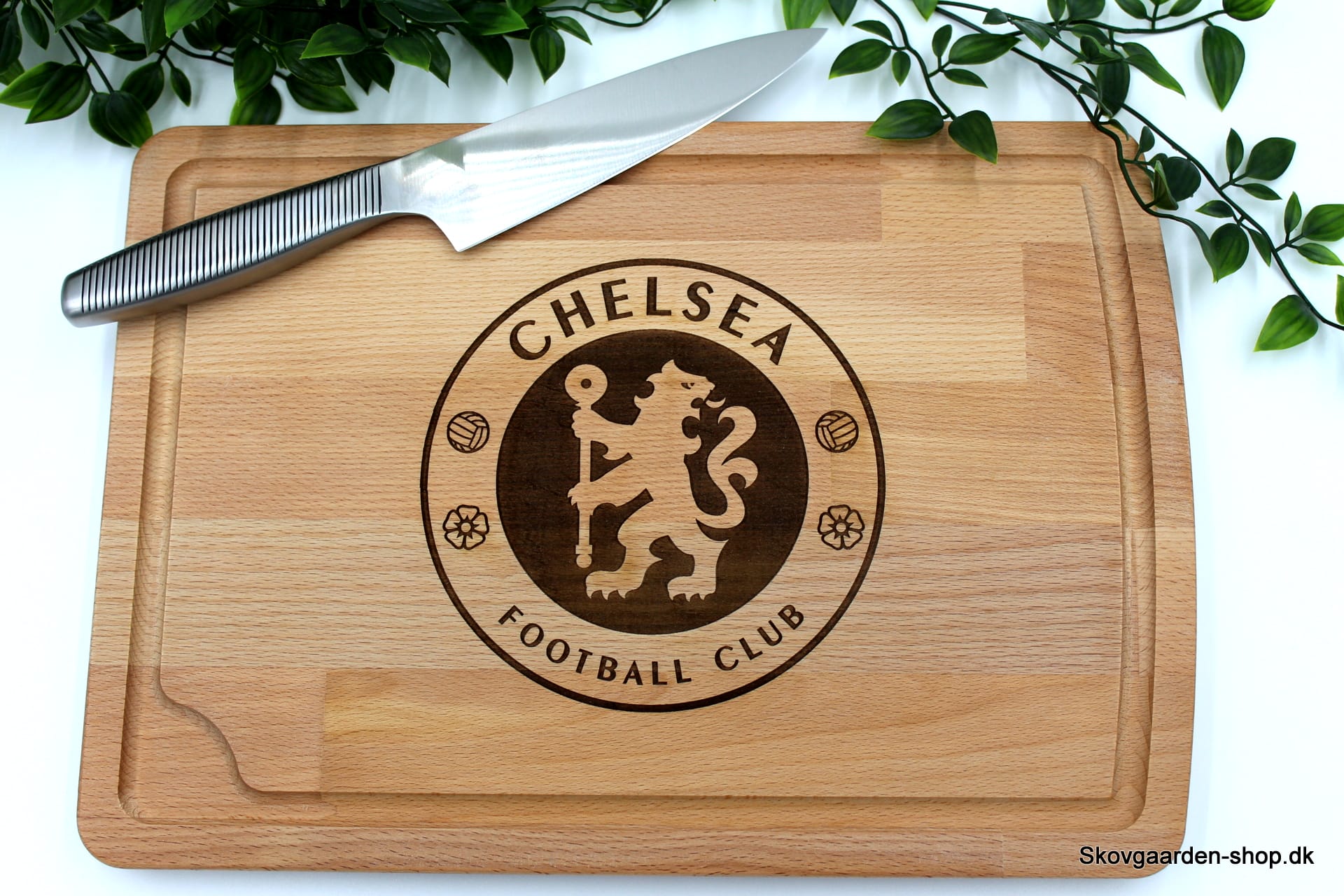 - Indgraveret skærebræt med Chelsea logo.