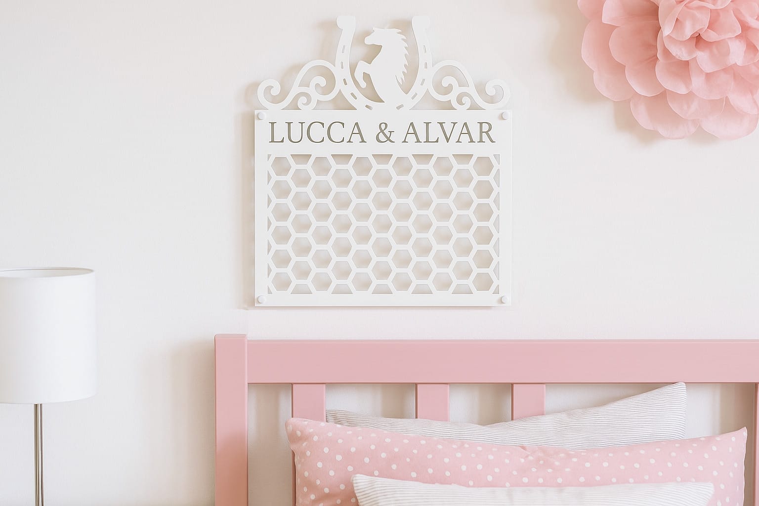 Drømmer du om en smuk og praktisk måde at vise dine rosetter frem på? Med denne Rosette holder med navn får du et helt unikt ophæng, der kombinerer flot design med funktionalitet. Holderen er udformet i stål og dekoreret med en hestesko, hvor en hest stejler inde i hesteskoen. På hver side flankeres motivet af et elegant mønster, der giver et eksklusivt udtryk.