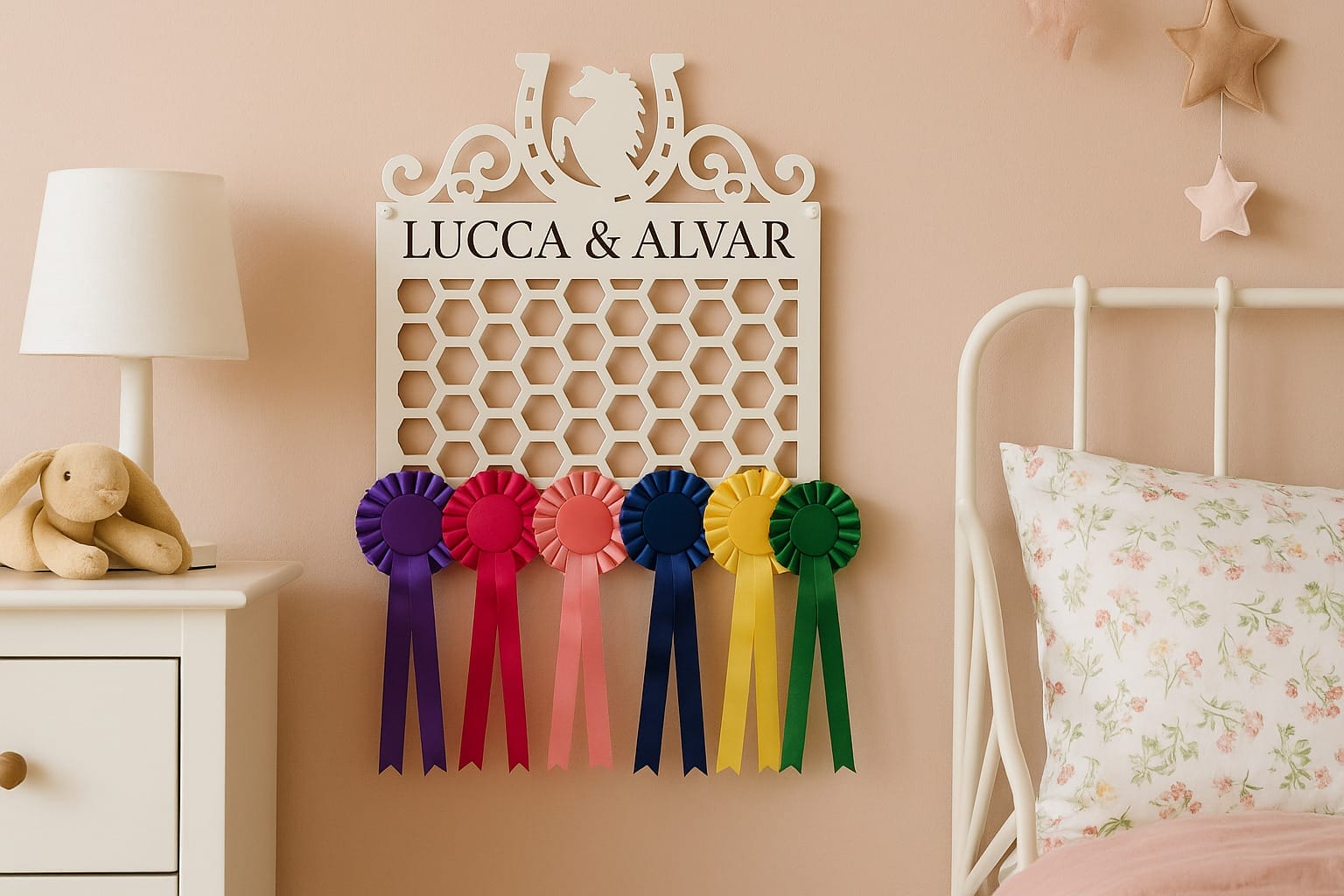 Med denne Classic – Rosette holder med Navn får du ikke bare en praktisk løsning – du får en smuk og personlig udsmykning, der fremhæver dine rosetter på bedste vis.