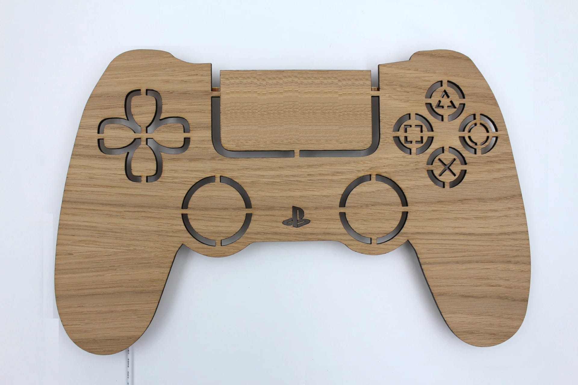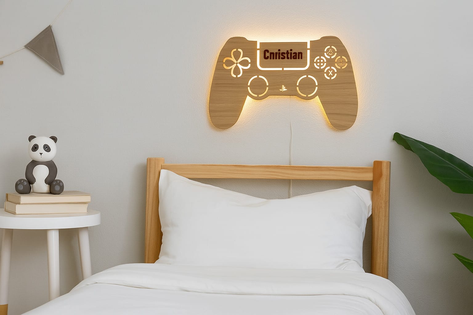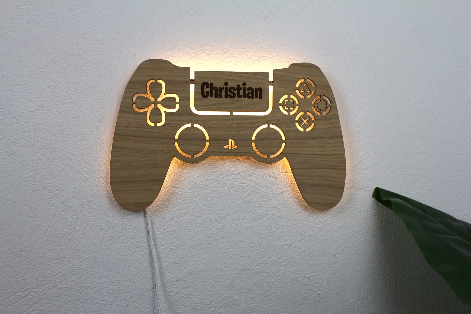 Sød lampe med motiv af PS controller i egefiner inklusiv indgraveret navn.
