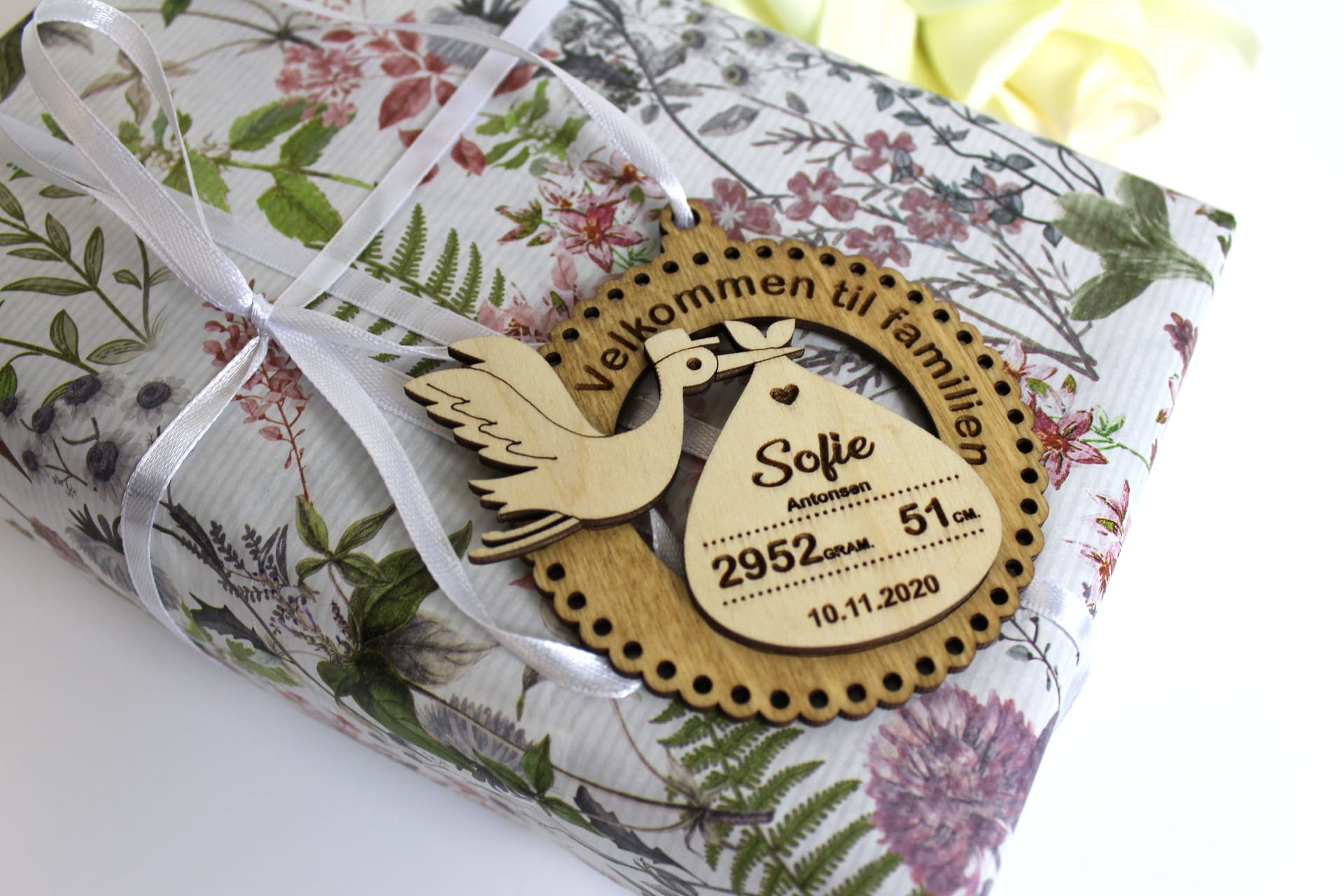 Skriv barnets informationer i tekstboksen, så sørger vi for at lave et smukt ornament til minde om det lille mirakel.