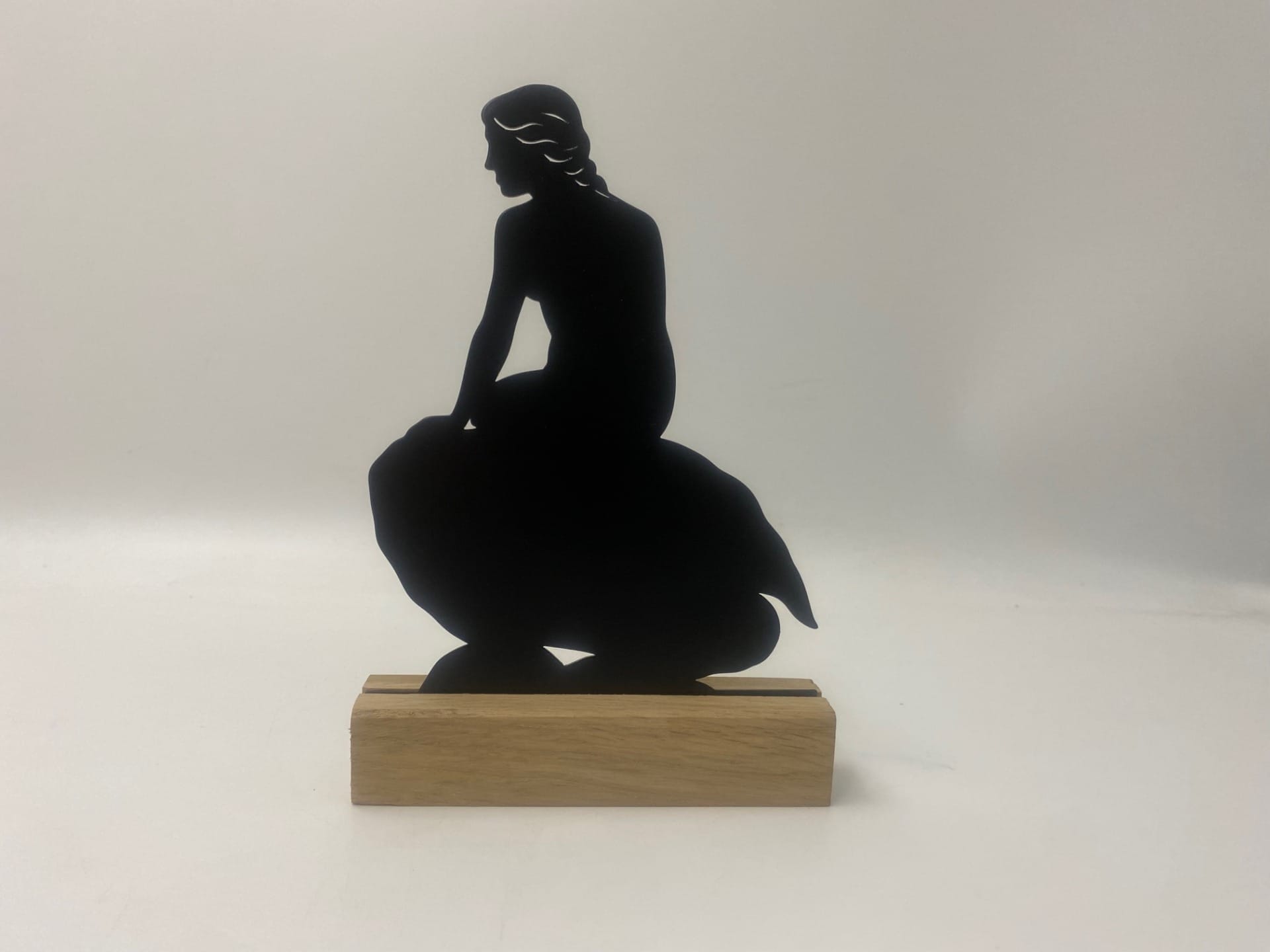 Bring et strejf af dansk kulturarv og tidløst design ind i dit hjem med denne elegante skulptur af Den Lille Havfrue. Figuren er udført i sort pulverlakeret stål og står smukt på en træfod i eg, som giver et varmt og naturligt udtryk. Kombinationen af det rå stål og den lyse eg gør figuren til et klassisk eksempel på Nordisk inspireret brugskunst – minimalistisk, æstetisk og fuld af ro.