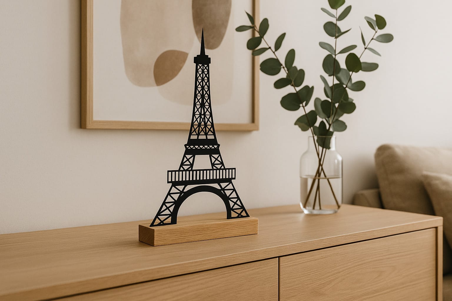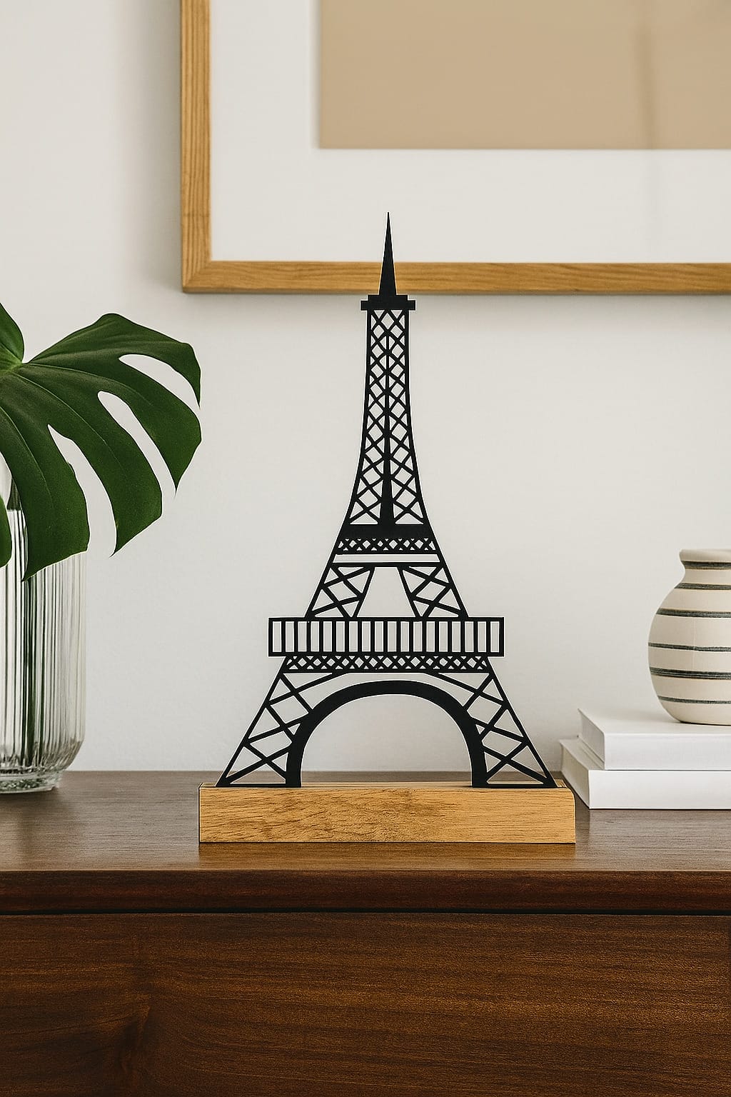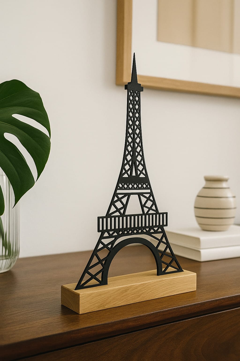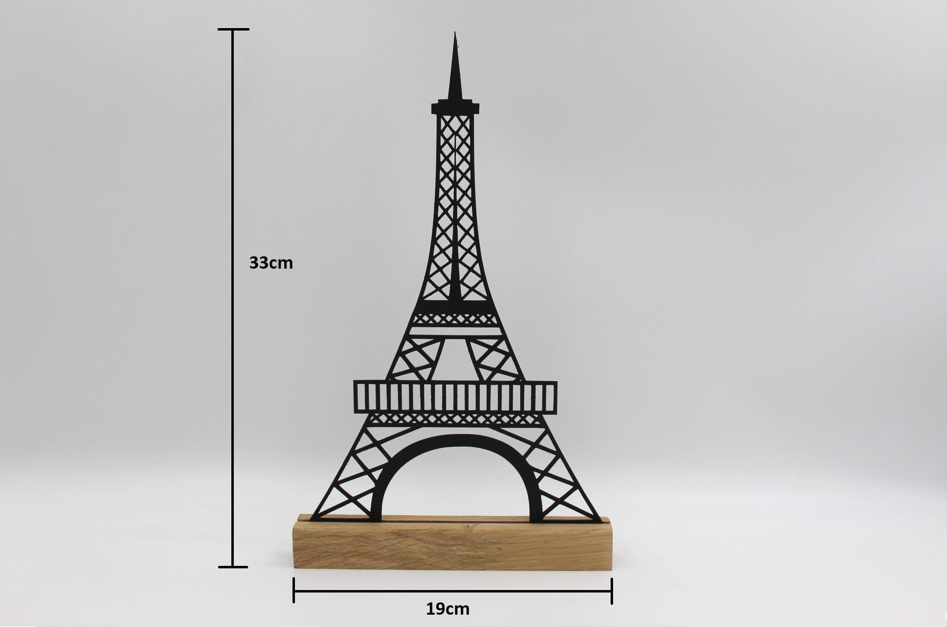 Vores Eiffeltårn-silhuet på egetræsfod er den perfekte gave til alle, der elsker design, kunst og boligindretning. Dette moderne kunstværk vil med sikkerhed bringe smil og beundring til alle, der modtager det.