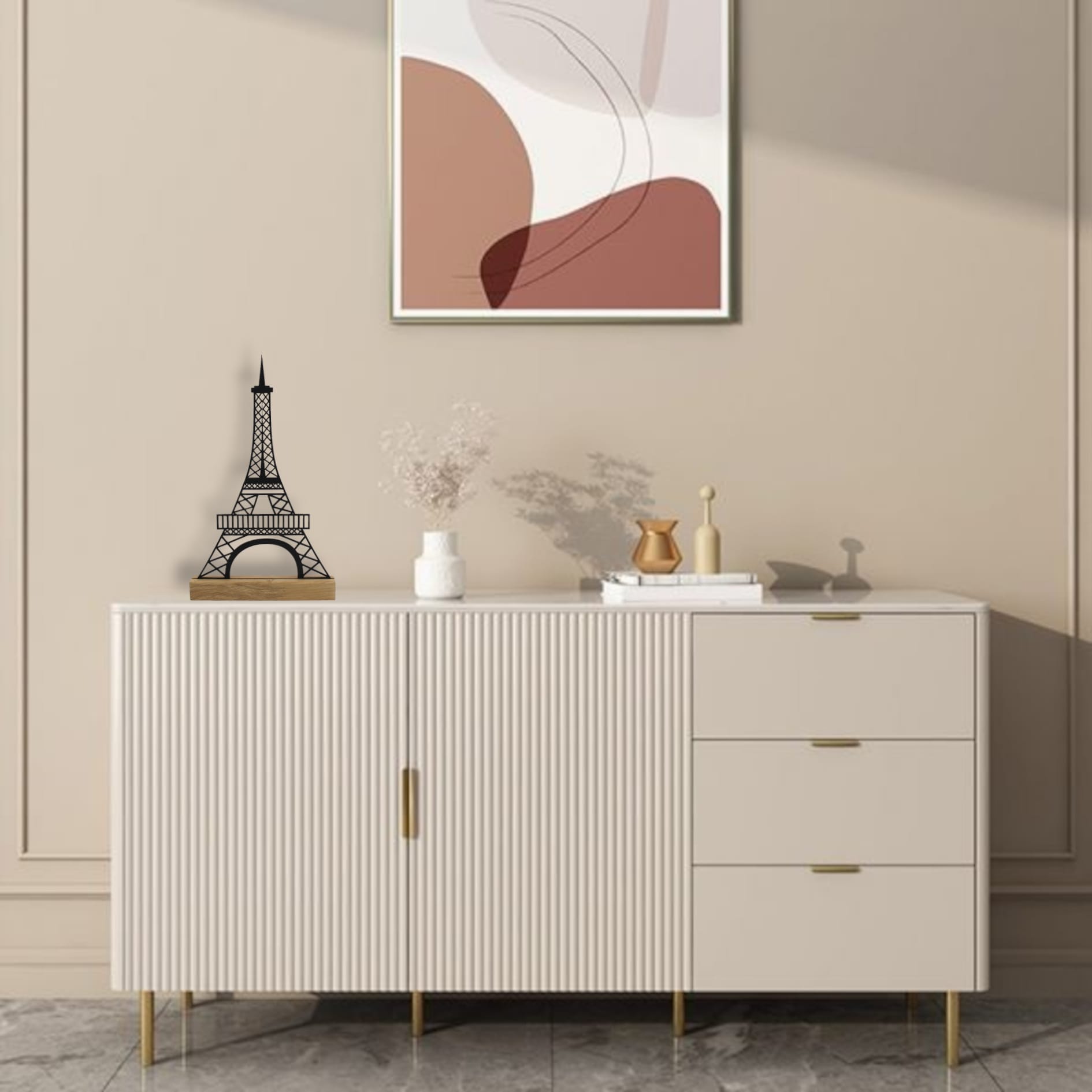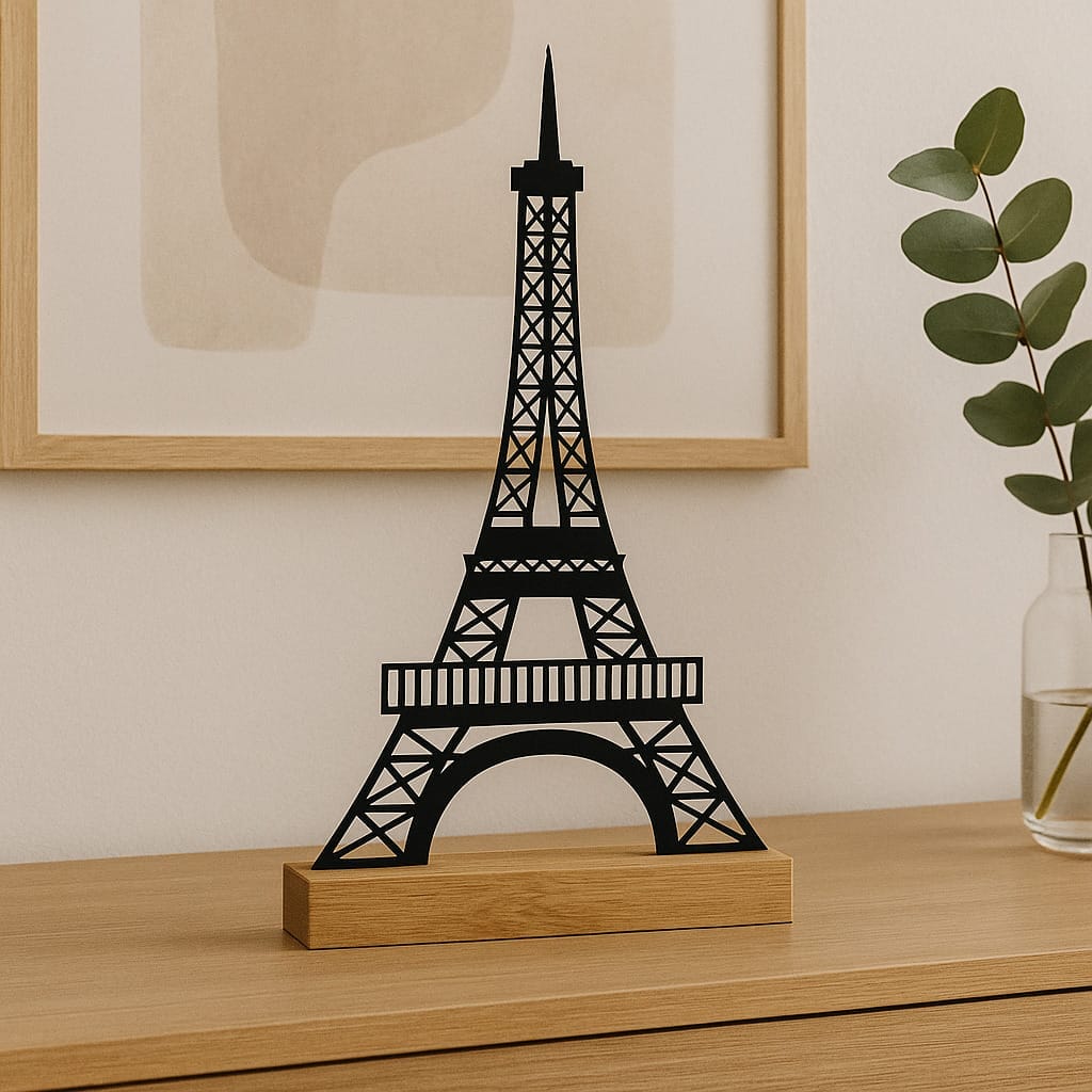 Skab en stemning af tidløs elegance i dit hjem med vores præcisionslaserudskårne silhuet af Eiffeltårnet. Dette smukt designede kunstværk er ikke kun et ikonisk symbol for romantik og eventyr i Paris, men også en hyldest til nordisk inspireret brugskunst og moderne design.
