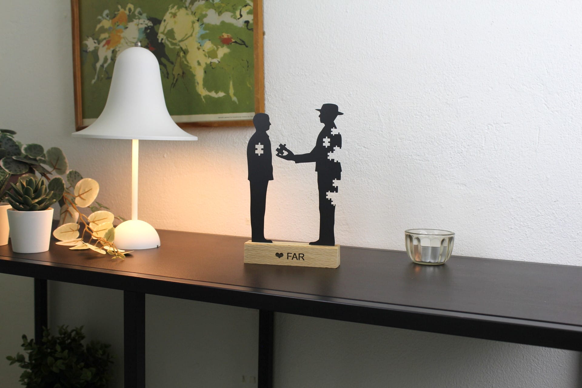 Motivet er udskåret i sortlakeret stål og står på en elegant træfod i eg, som tilfører varme og karakter. På træfoden kan du få indgraveret din helt personlige tekst – det kunne være en hilsen, et navn eller en kort dedikation, der gør gaven ekstra mindeværdig.
