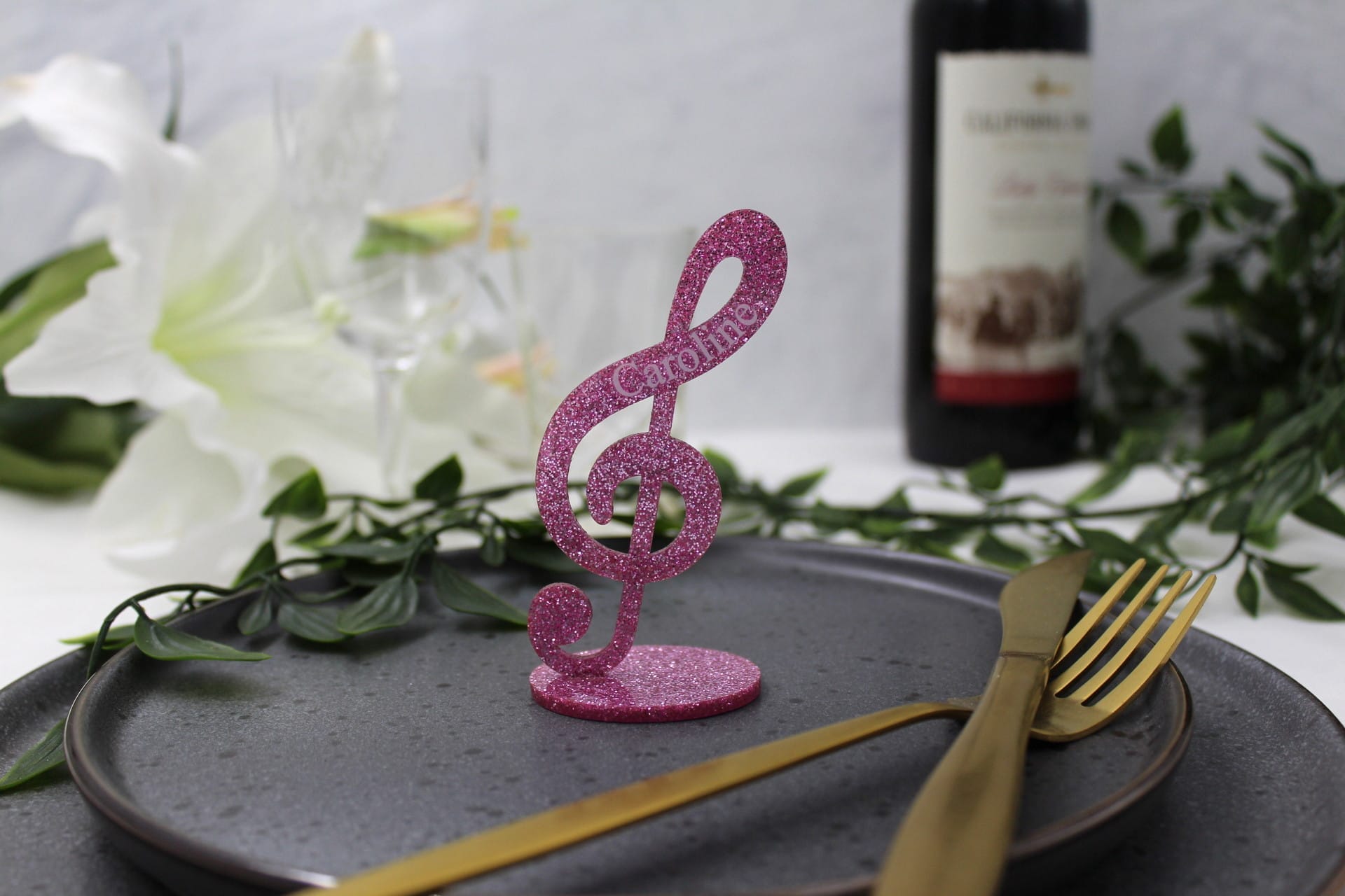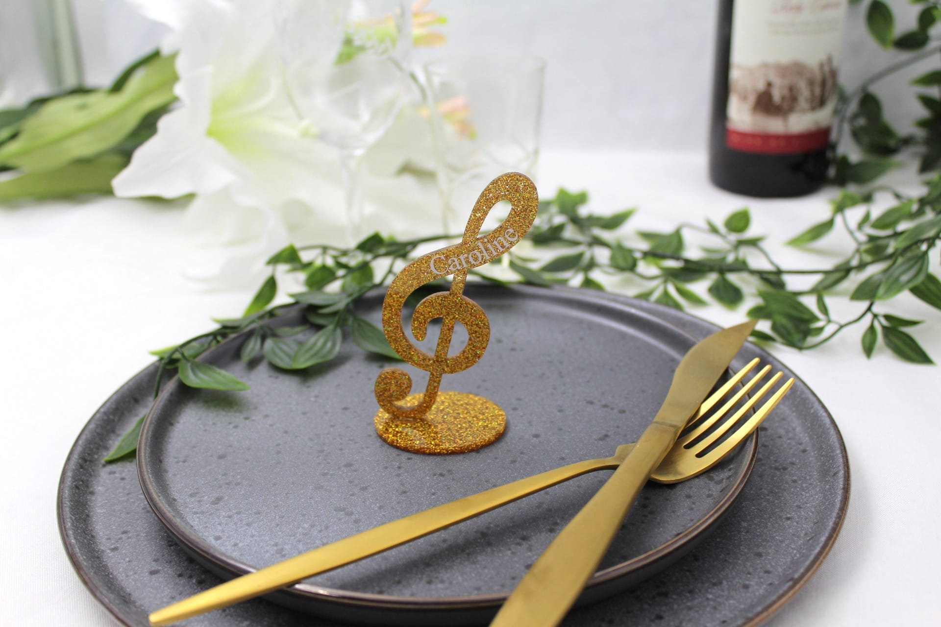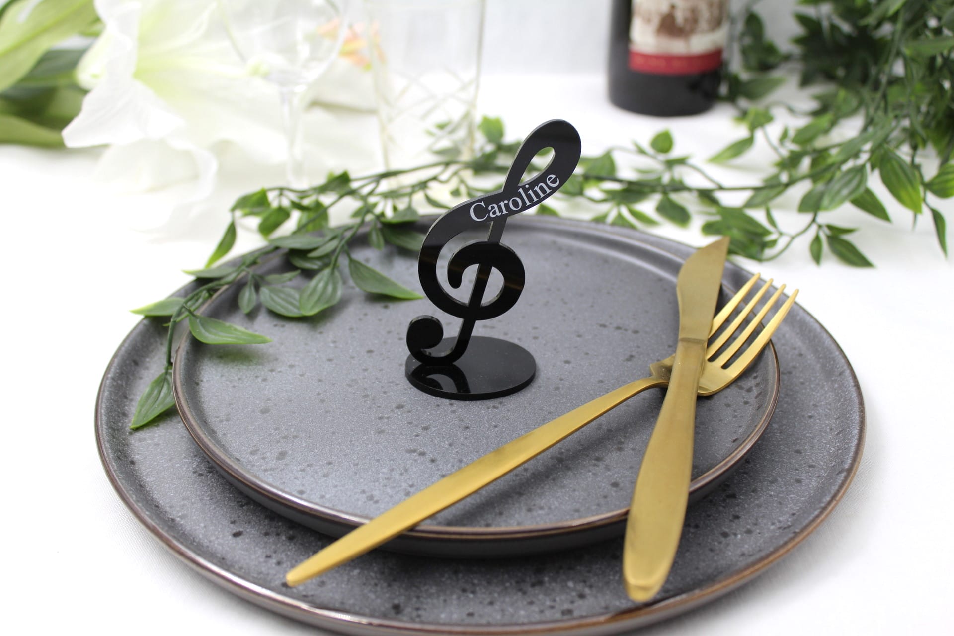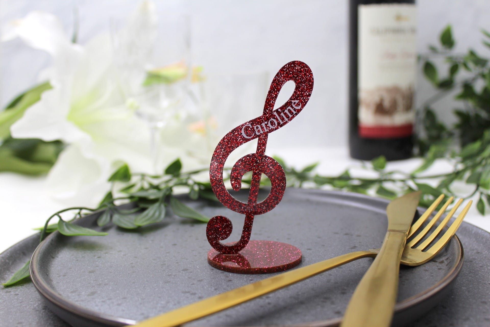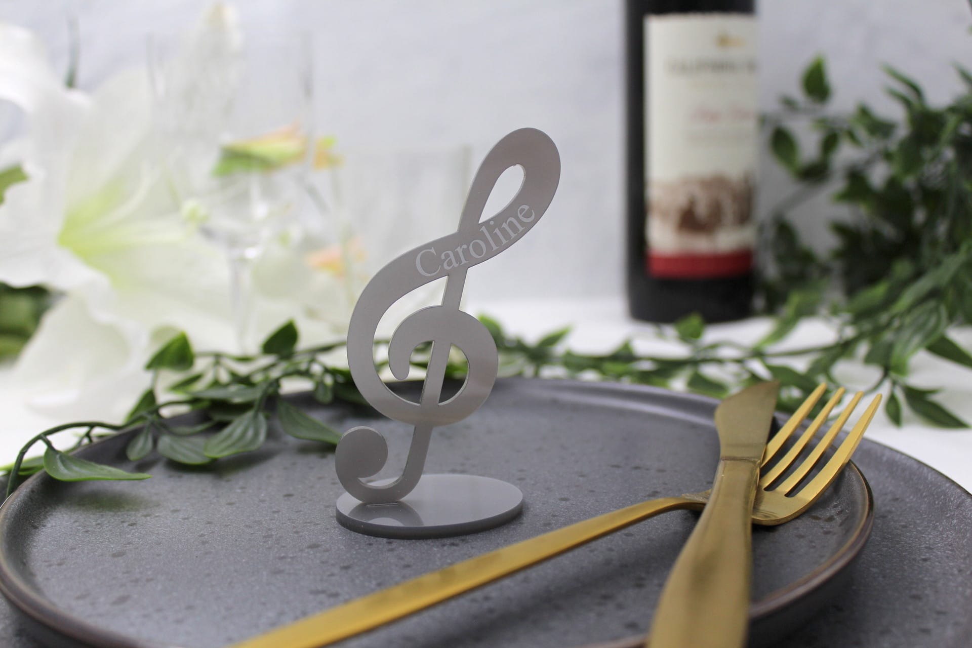 Vores bordkort til fest er ikke blot et bordkort – det er et lille kunstværk i sig selv. G-nøglen står flot på en fod og pryder bordet med elegance. Gæstens navn er indgraveret på siden, hvilket giver bordkortet et personligt touch, som dine gæster med sikkerhed vil værdsætte. Bordkortet er tilgængeligt i mange forskellige farver, så du kan vælge den perfekte farve, der passer til temaet for netop din fest. Det gør vores bordkort til bryllup, konfirmation, dåb eller barnedåb til noget helt særligt og unikt.