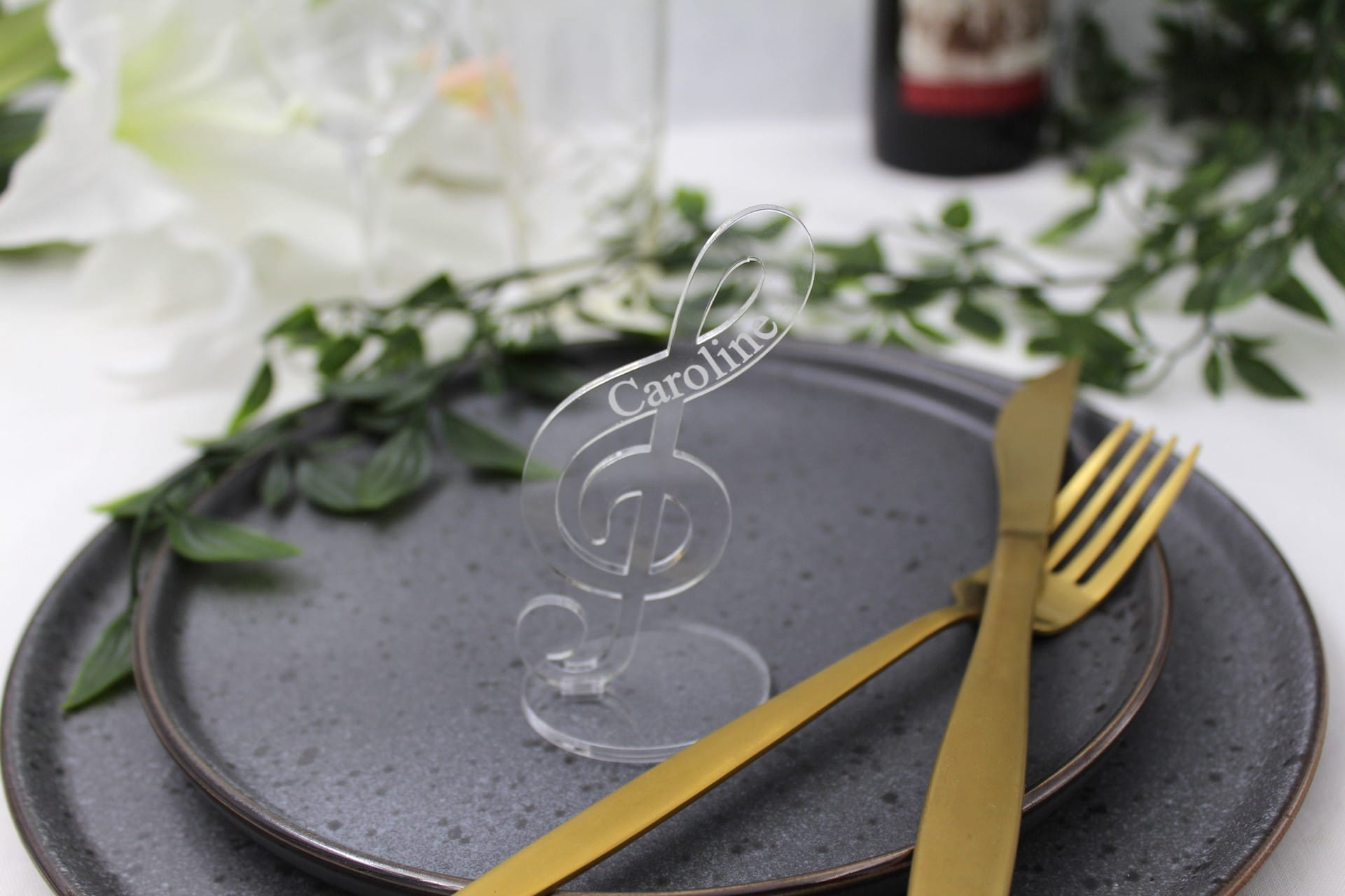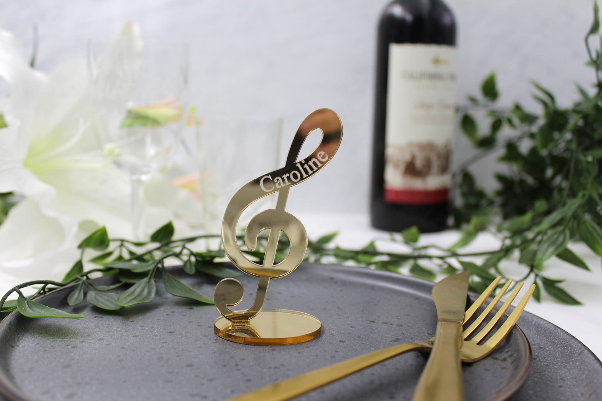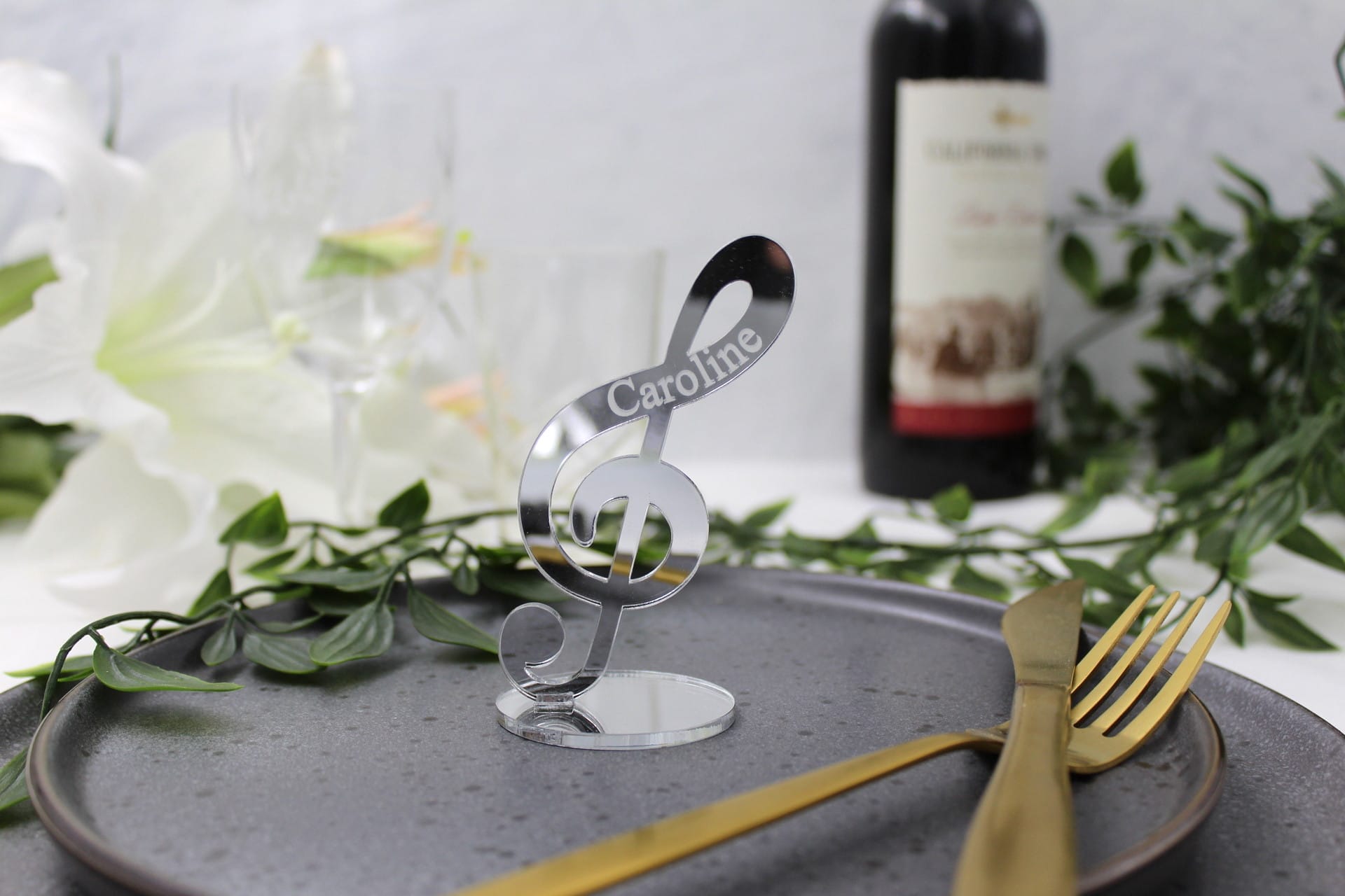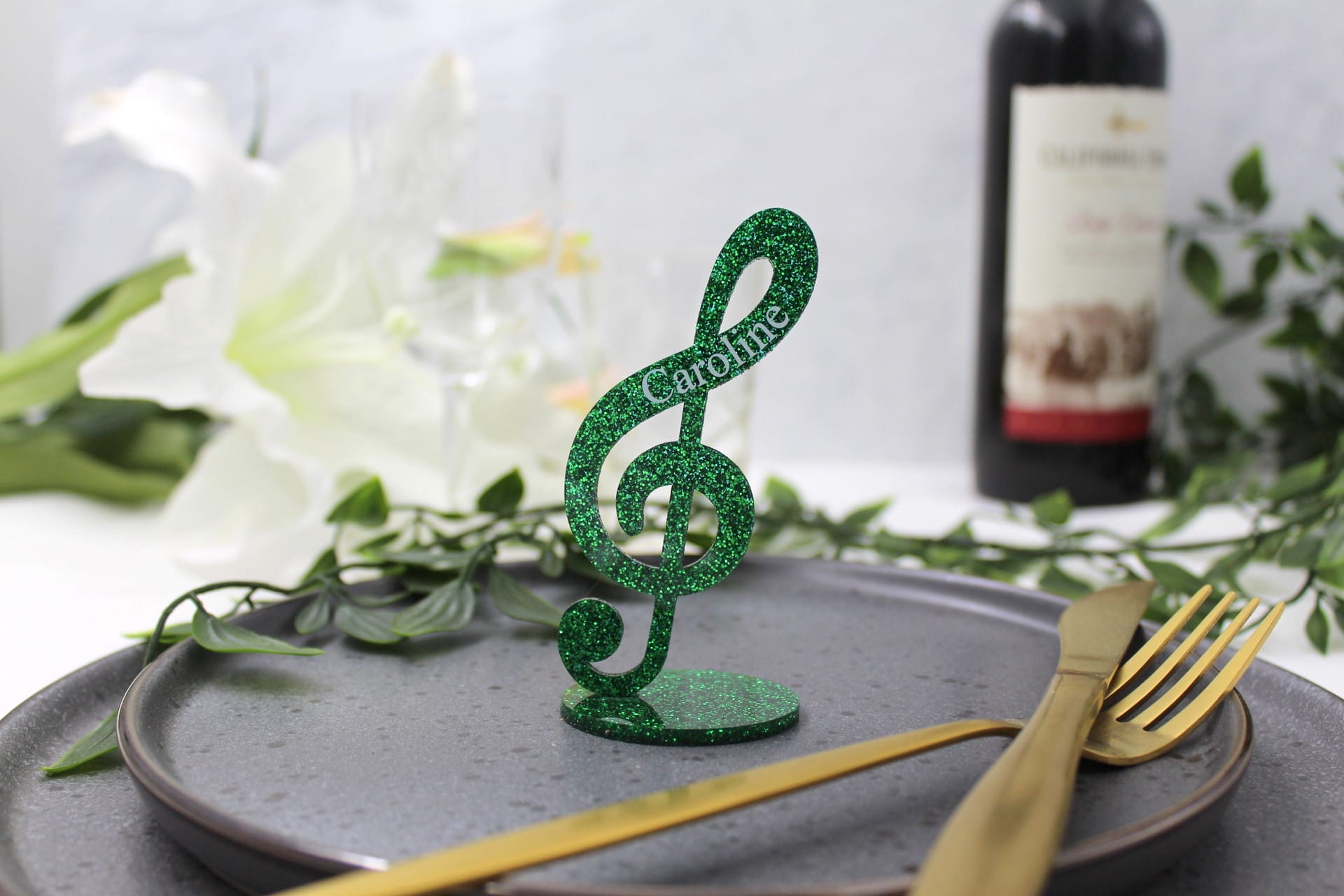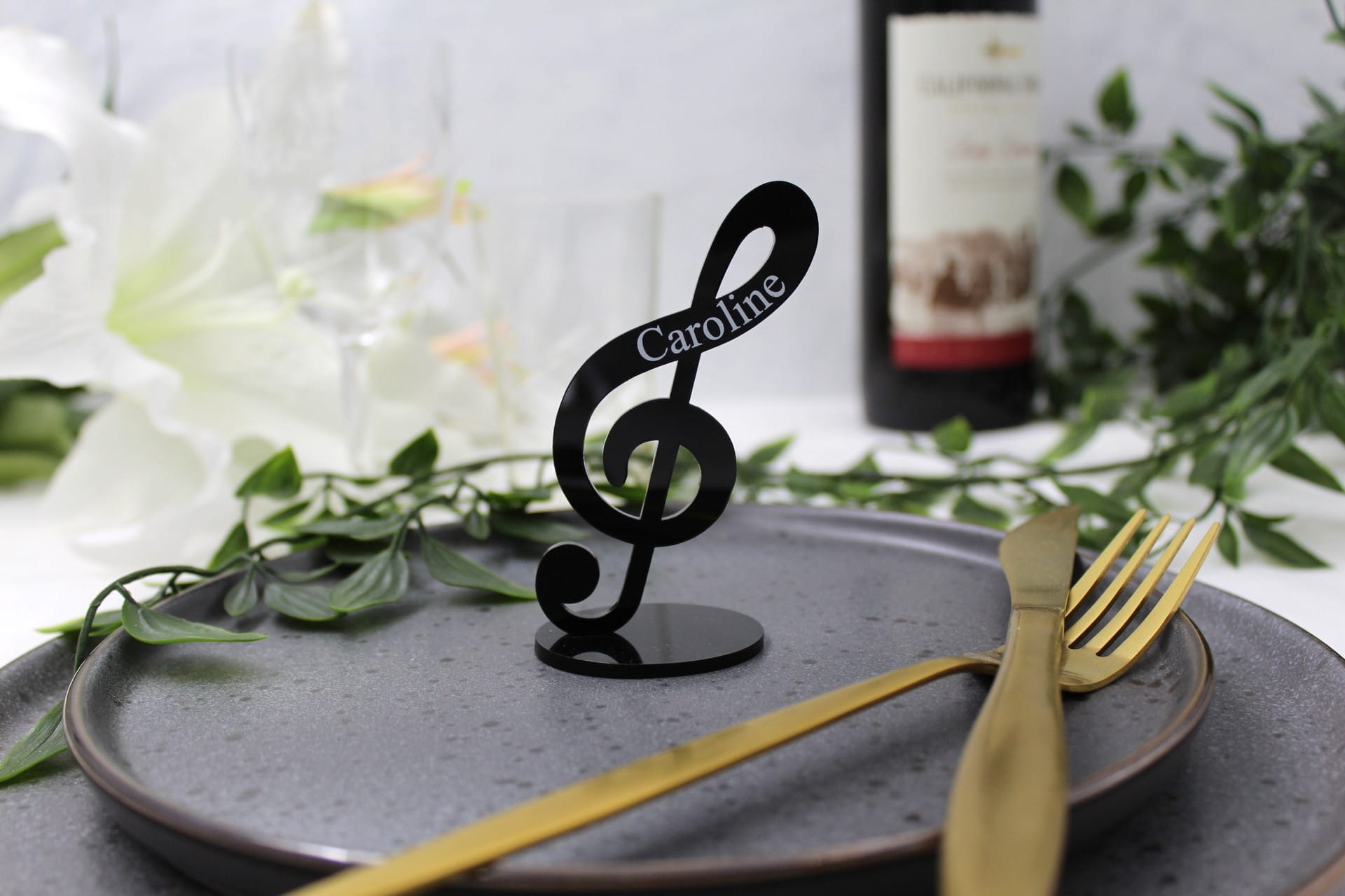Vores bordkort til fest er ikke blot et bordkort – det er et lille kunstværk i sig selv. G-nøglen står flot på en fod og pryder bordet med elegance. Gæstens navn er indgraveret på siden, hvilket giver bordkortet et personligt touch, som dine gæster med sikkerhed vil værdsætte. Bordkortet er tilgængeligt i mange forskellige farver, så du kan vælge den perfekte farve, der passer til temaet for netop din fest. Det gør vores bordkort til bryllup, konfirmation, dåb eller barnedåb til noget helt særligt og unikt.