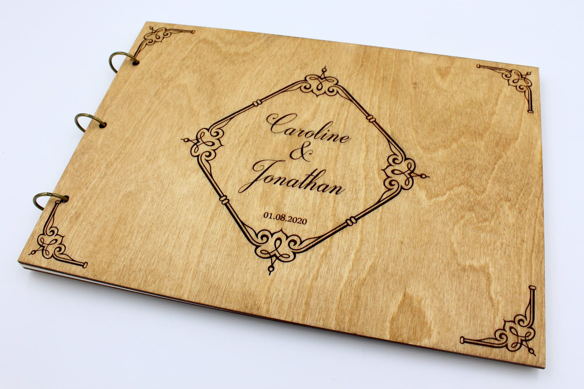 Få et unik og evigt minde om jeres store dag med denne smukke gæstebog ud skåret i træ eller akryl, og graveret med jeres navne og dato.