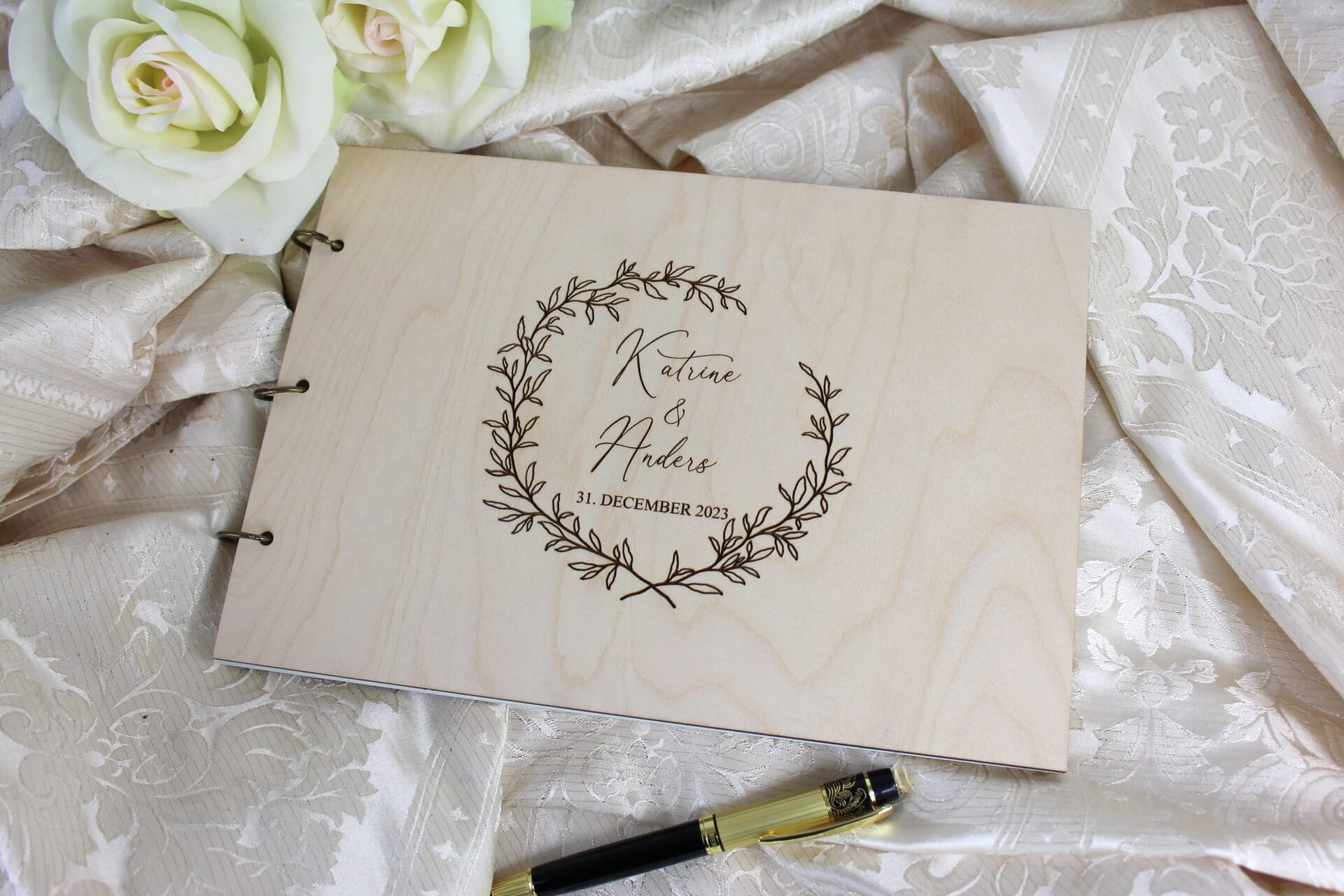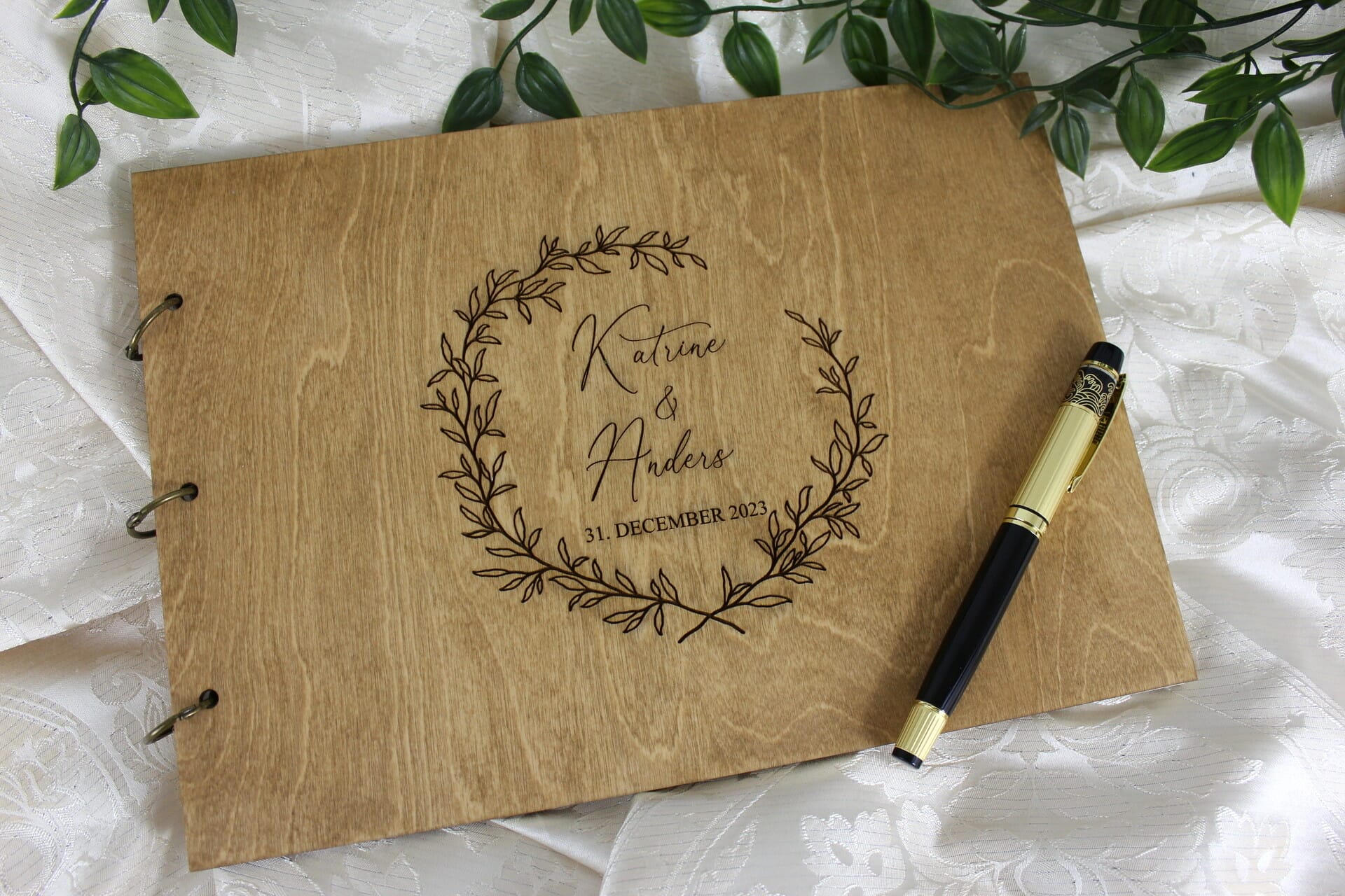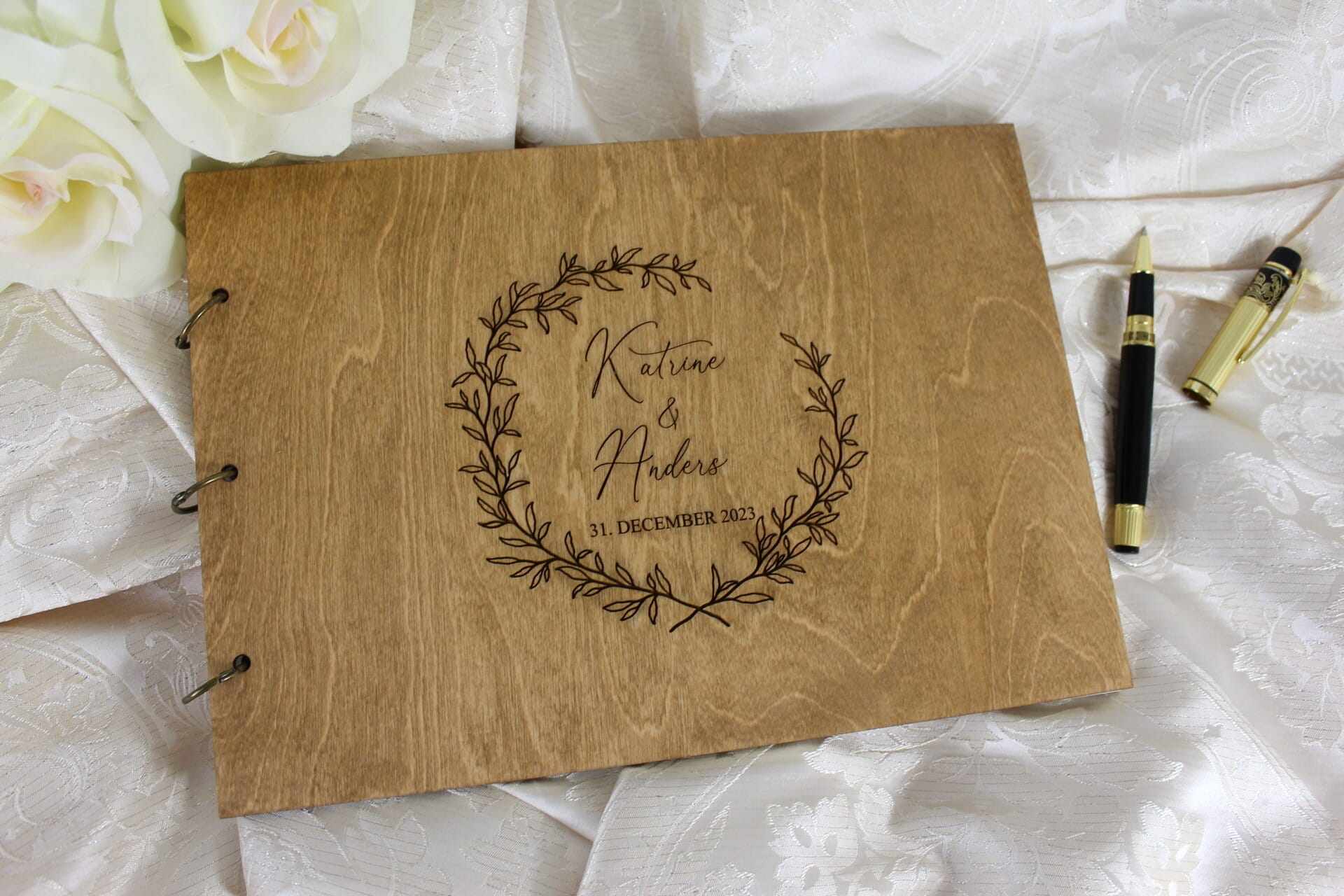 Ved at tilføje jeres navne og bryllupsdato til vores gæstebog med indgravering, skaber I et personligt og mindeværdigt element, der afspejler jeres kærlighedshistorie. Vores præcisionslaserindgraveringsteknik sikrer, at hvert bogstav og tal er perfekt udført, og at indgraveringen forbliver smuk og holdbar i mange år fremover.