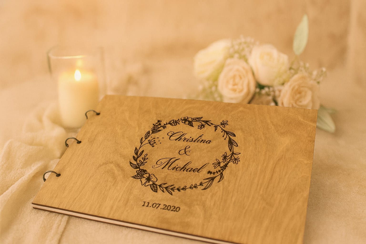 Vores Gæstebog i træ – Krans er tilgængelig i tre forskellige materialer: træ, akryl eller PU læder. Hver version har sin egen unikke fornemmelse og stil, og du kan vælge den, der passer bedst til din bryllupsstil og -tema.