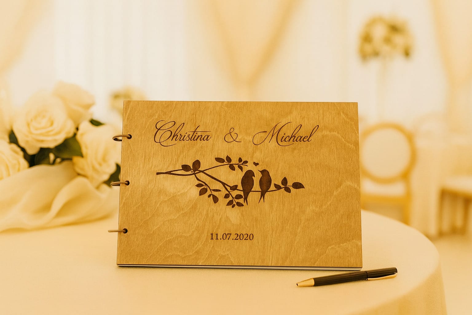 Vores gæstebog i træ er en præcisionslaserskåret gæstebog i udskåret træ. Hvert eksemplar er et unikt stykke håndværk, der er dansk designet og produceret med omhyggelig opmærksomhed på detaljer. Lavet i træ, akryl eller PU læder, vores gæstebog er en smuk og personlig erindring om jeres specielle dag.