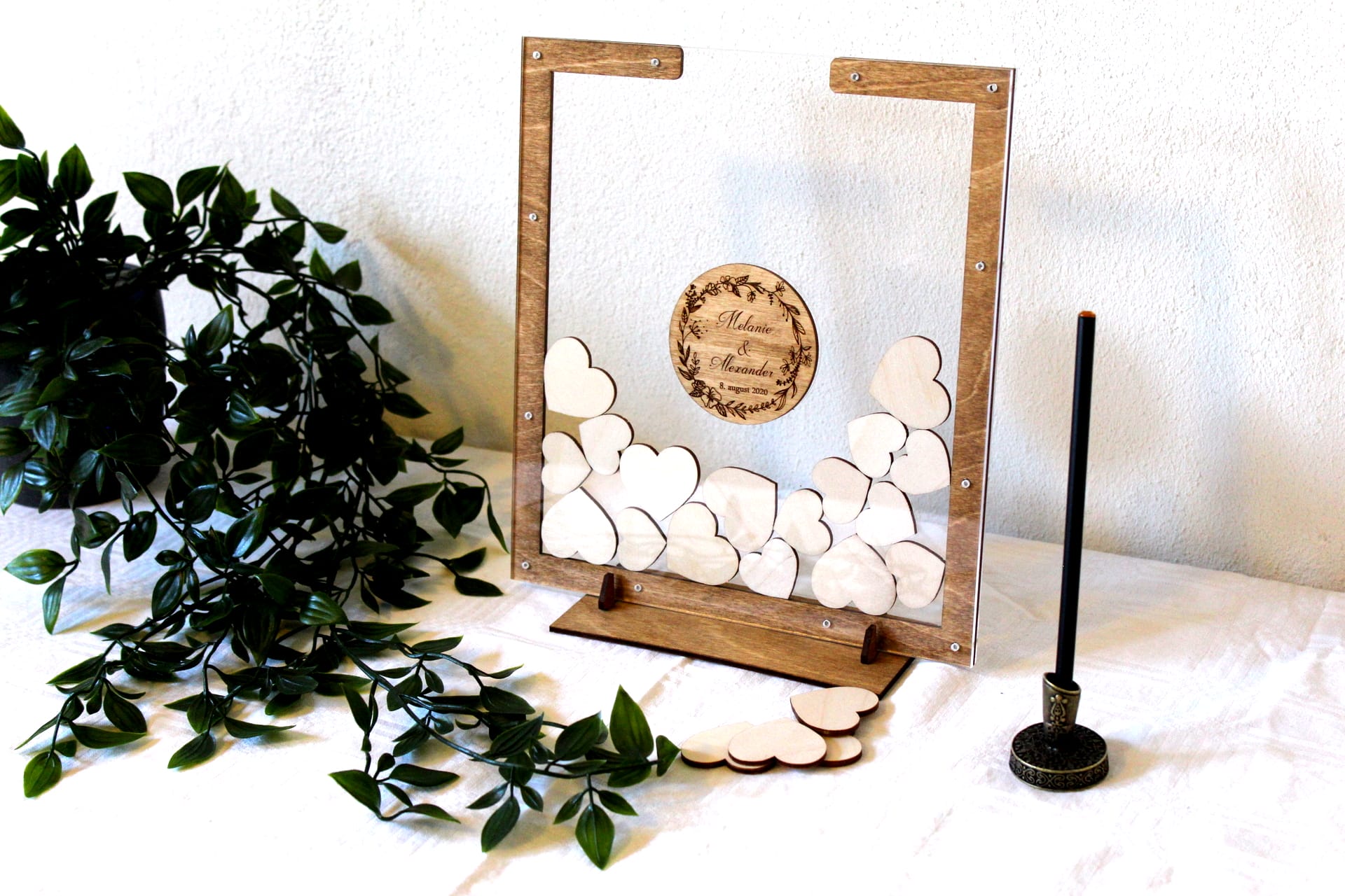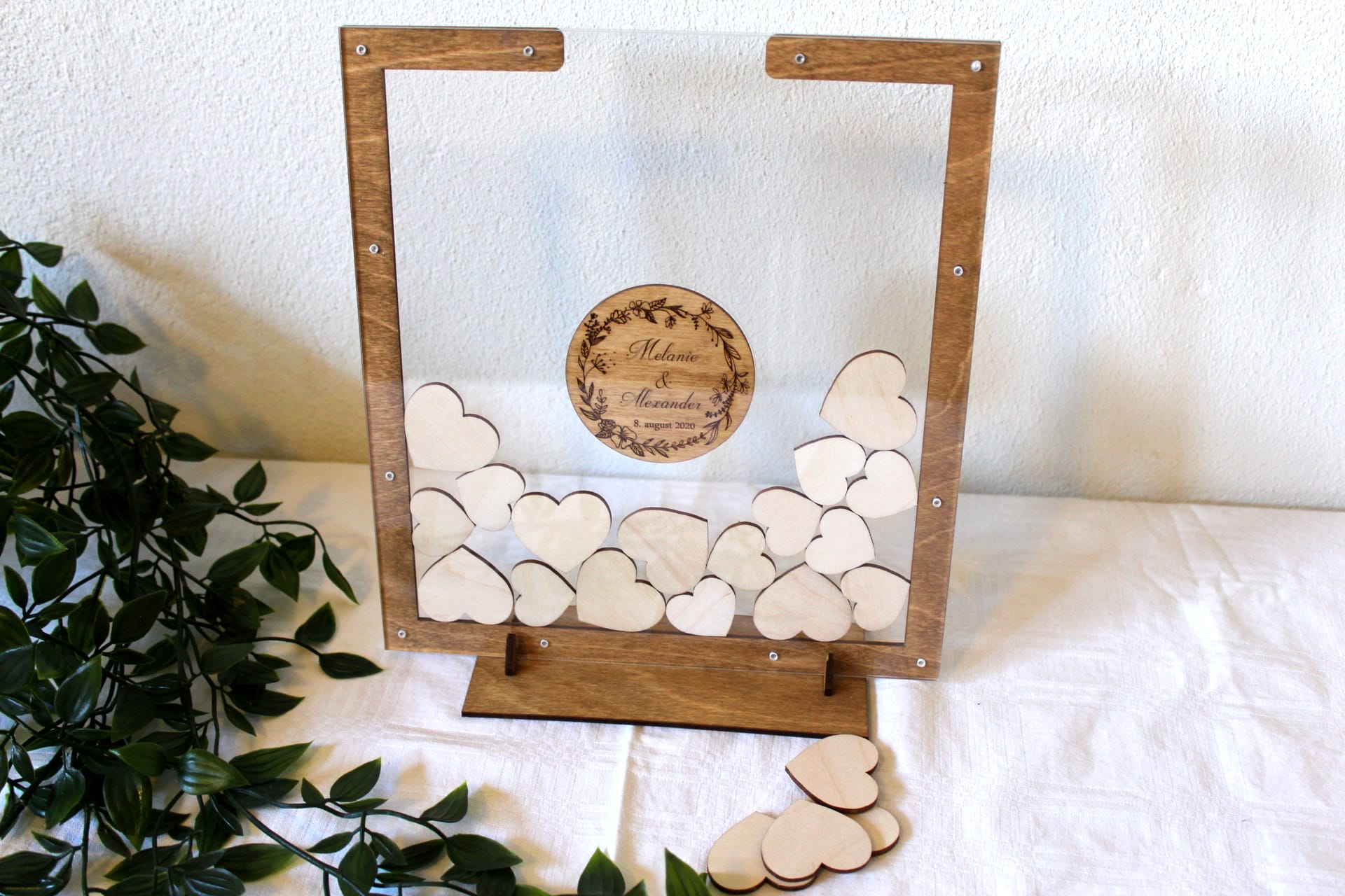Få et unik og evigt minde om jeres store dag med denne smukke gæstebog i kombination af akryl og træ. Centeret er graveret med jeres navne og dato for brylluppet.