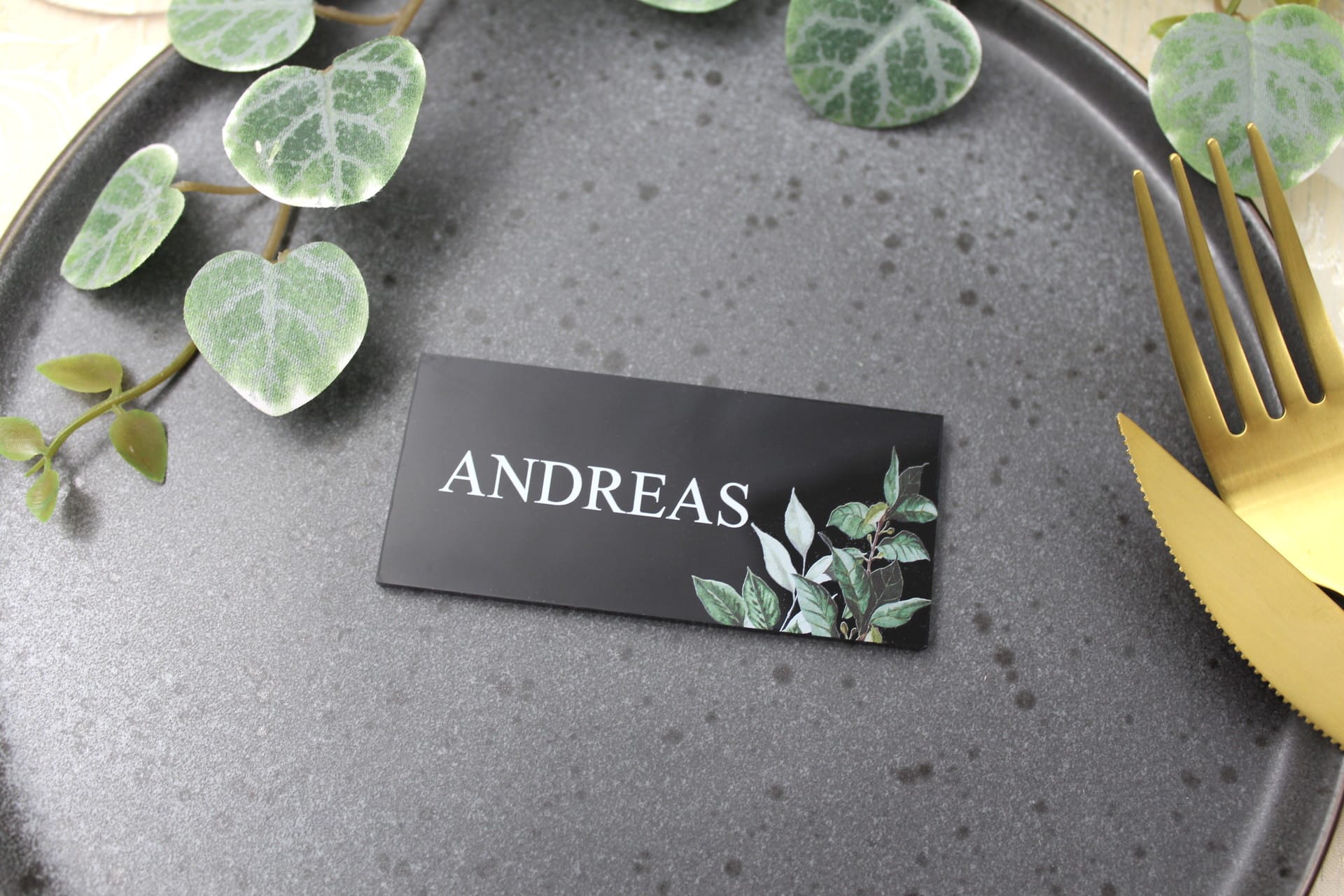 Vælg vores sorte akrylbordkort med grønne blade og hvidt navn for at tilføje en luksuriøs og unik touch til din næste specielle begivenhed. Vores bordkort er sikker på at imponere og gøre en varig indtryk på dine gæster. Bestil dit bordkort i dag og forbered dig på at blive beundrede af alle, der besøger dit bord