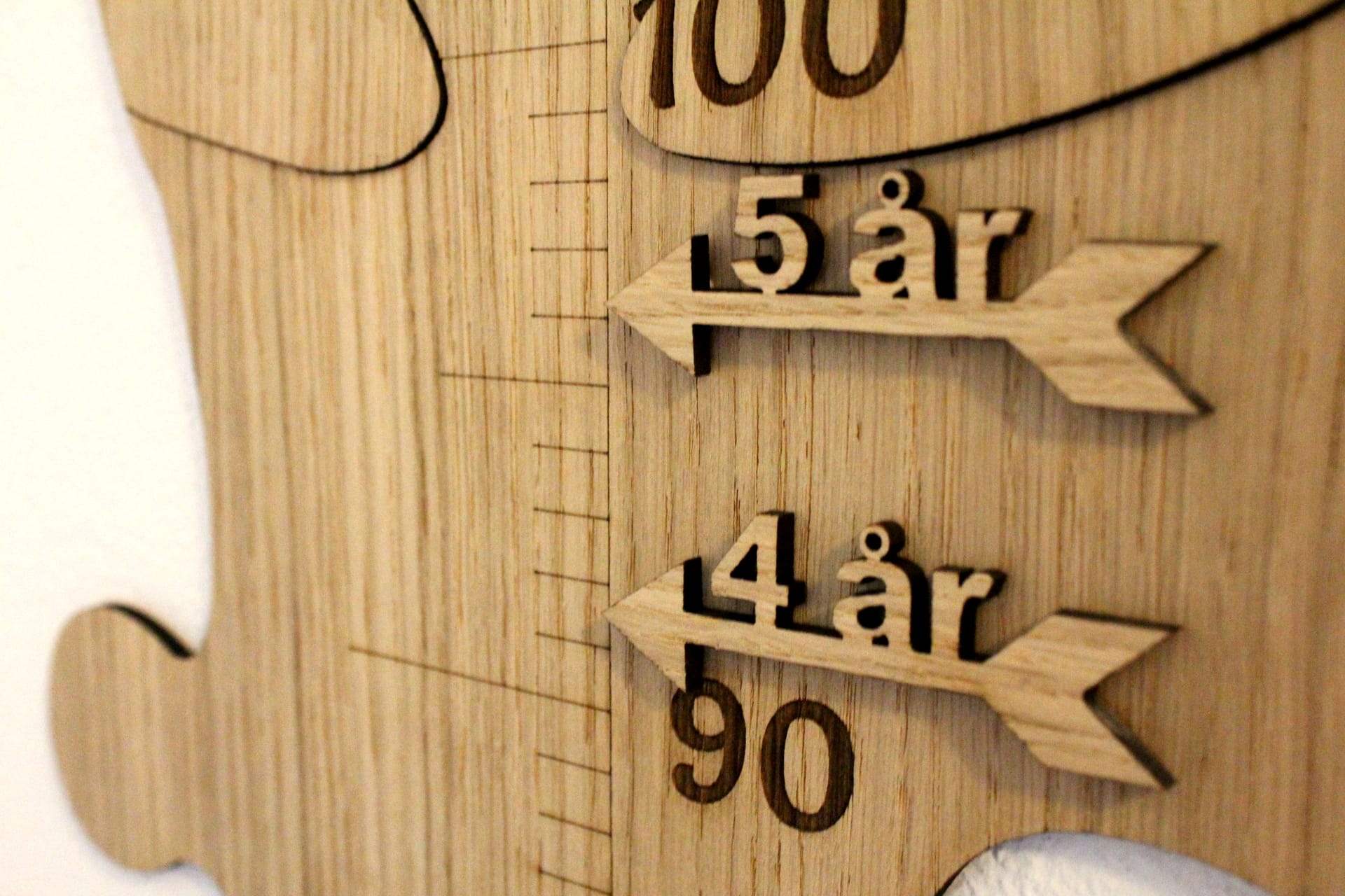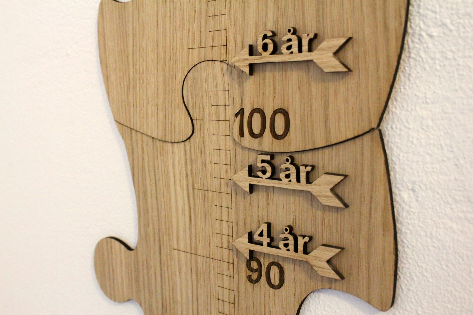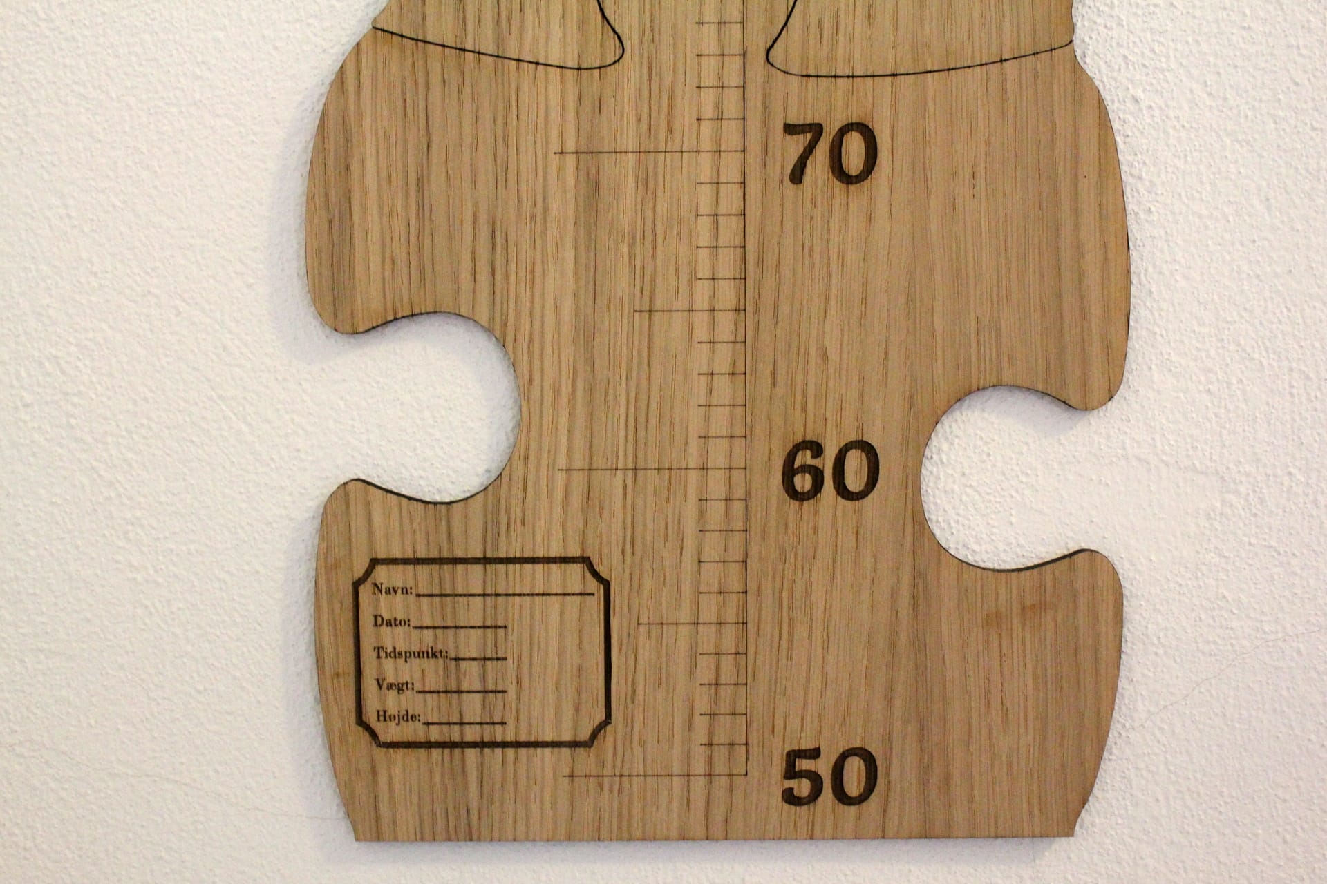 Skovgaardens højdemåler udført som et puslespil, til at sætte op på væggen, gør det let og overskueligt for dig at følge dit barns udvikling. Sæt et mærke for hvert år med de medfølgende pile, så du ved hvor meget dit barn vokser hvert år på en sjov og anderledes måde. Højdemåleren er udskåret i det fineste ege- eller valnøddefiner. Vælg selv hvad der passer bedst ind i din indretning.