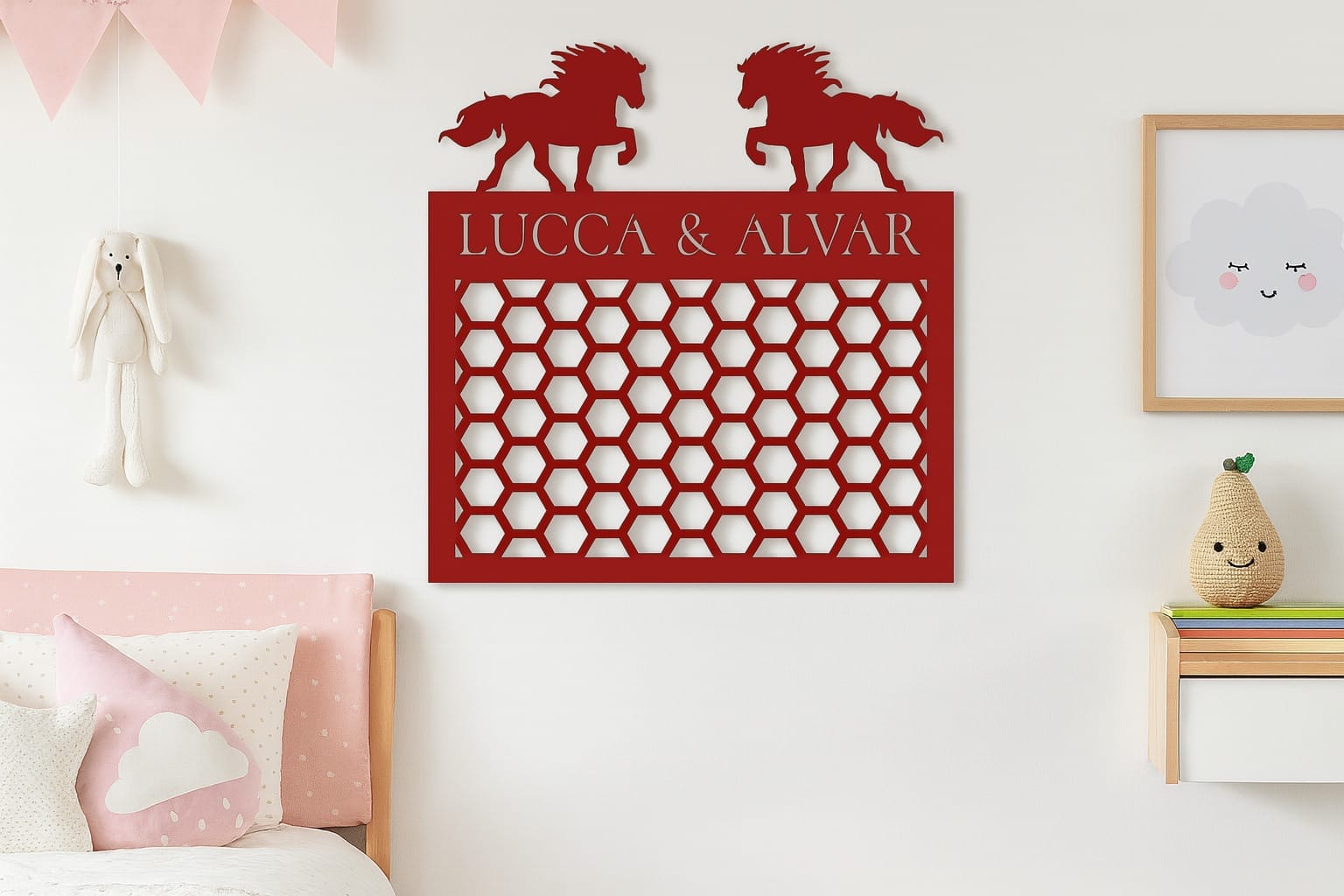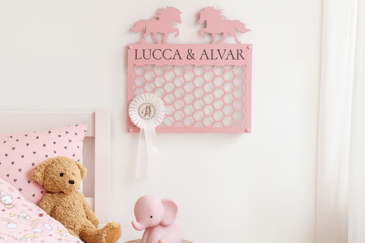 Med sit stilrene og funktionelle design giver denne personlige Rosette holder dig en smart måde at opbevare dine rosetter på – samtidig med at den pynter flot i hjemmet, stalden eller på værelset.