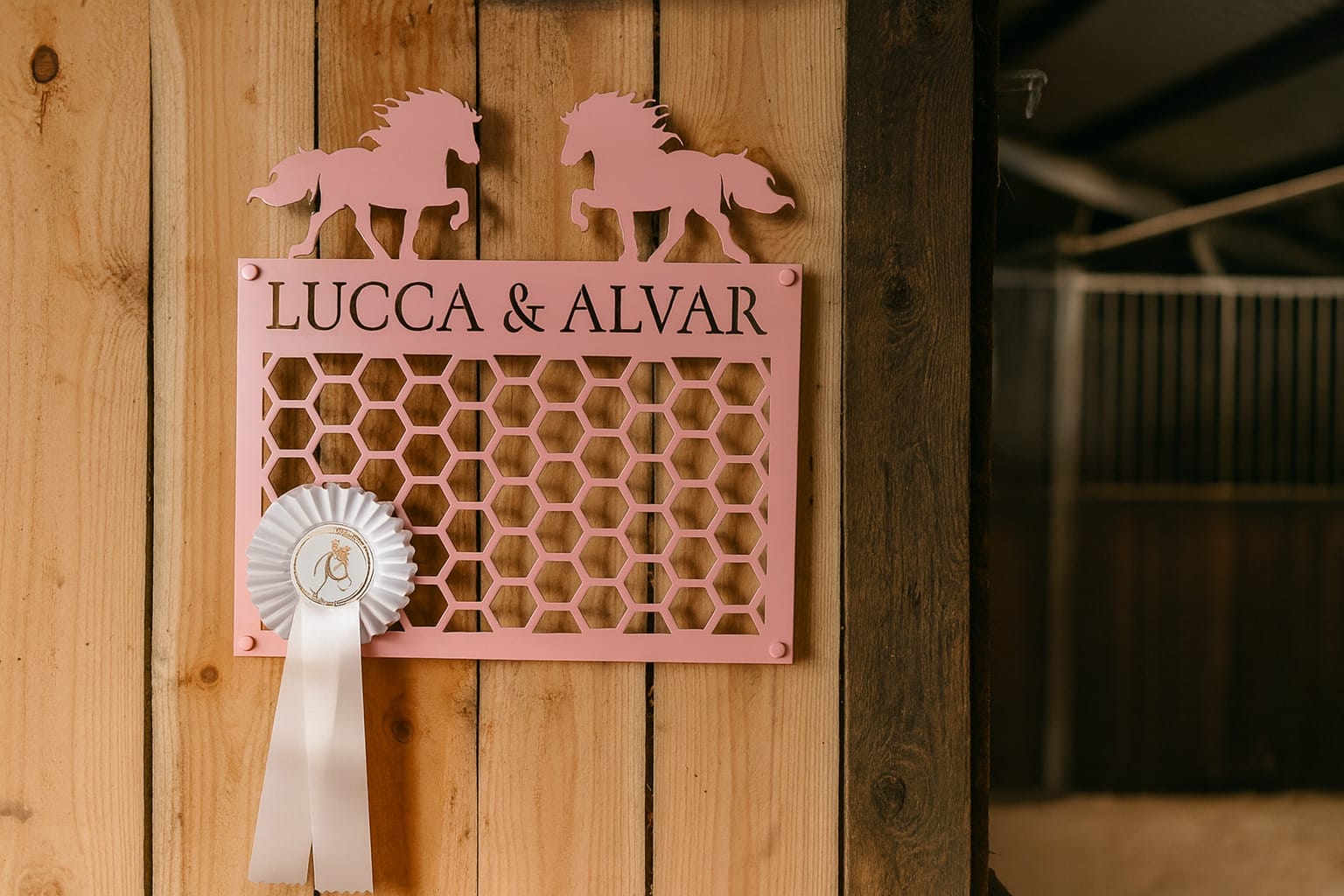 Gør dine præmier til en del af indretningen med en Rosette holder med navn. Denne elegante Roset holder i stål er designet specielt til ryttere med kærlighed til islænderheste. Øverst pryder to smukke islænderheste motivet, og under hestene kan du få udskåret dit navn eller en personlig tekst, så holderen bliver helt unik.