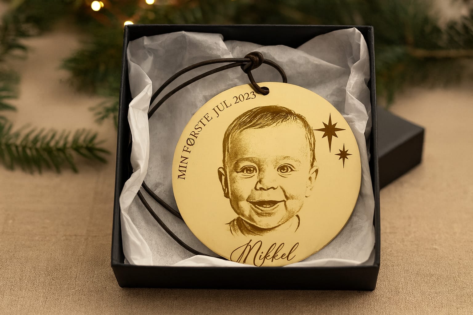 Dette juleornament i messing er ikke bare pynt – det er et minde, der kan tages frem og hænges på juletræet år efter år. Det er den perfekte personlige gave til jul, der skaber glæde og hygge i familien. Ornamentet leveres i en flot sort gaveæske, så du nemt kan give det som en stilfuld og unik gaveidé.