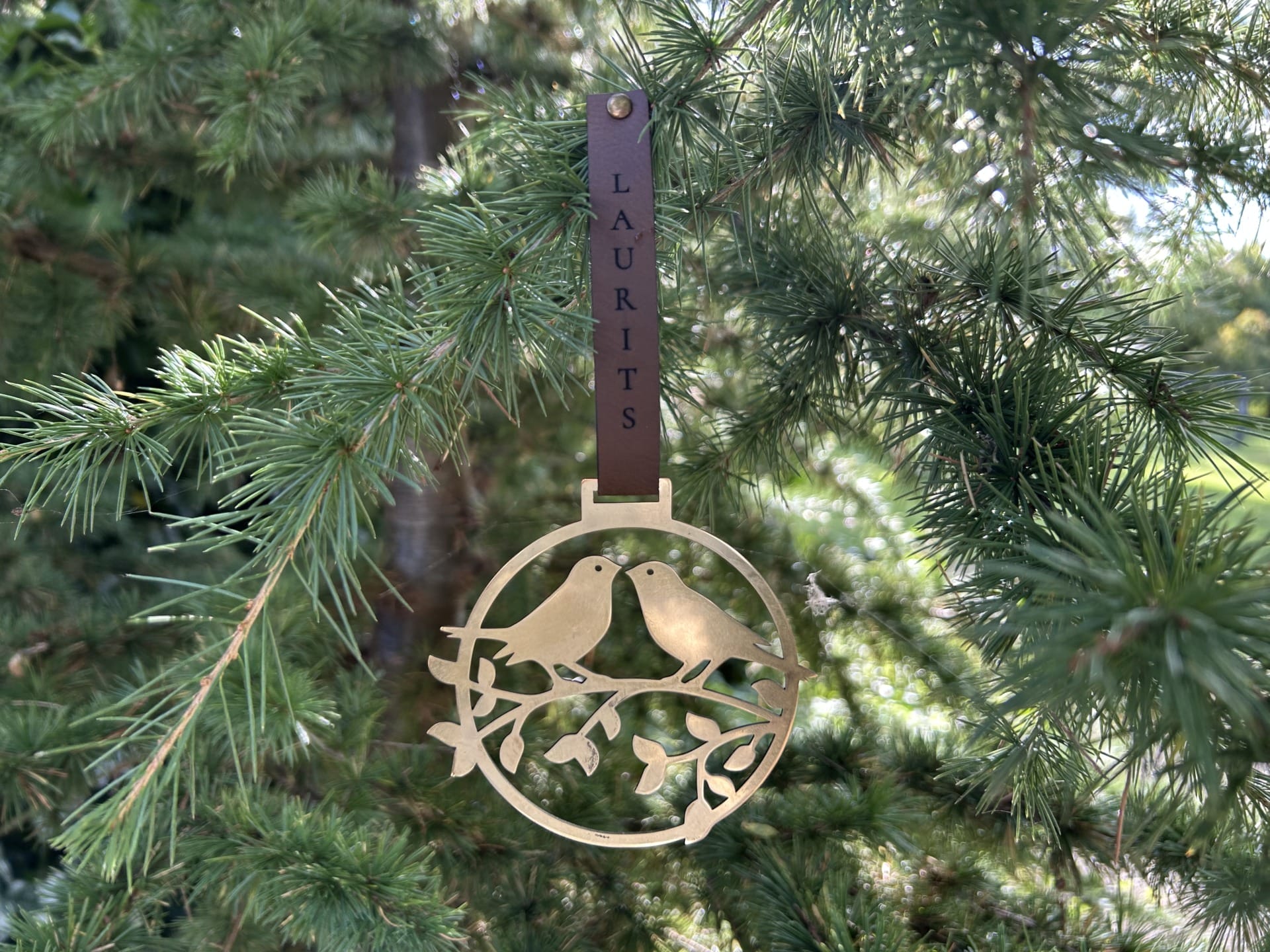 Juleornament i messing med to små fugle i et træ