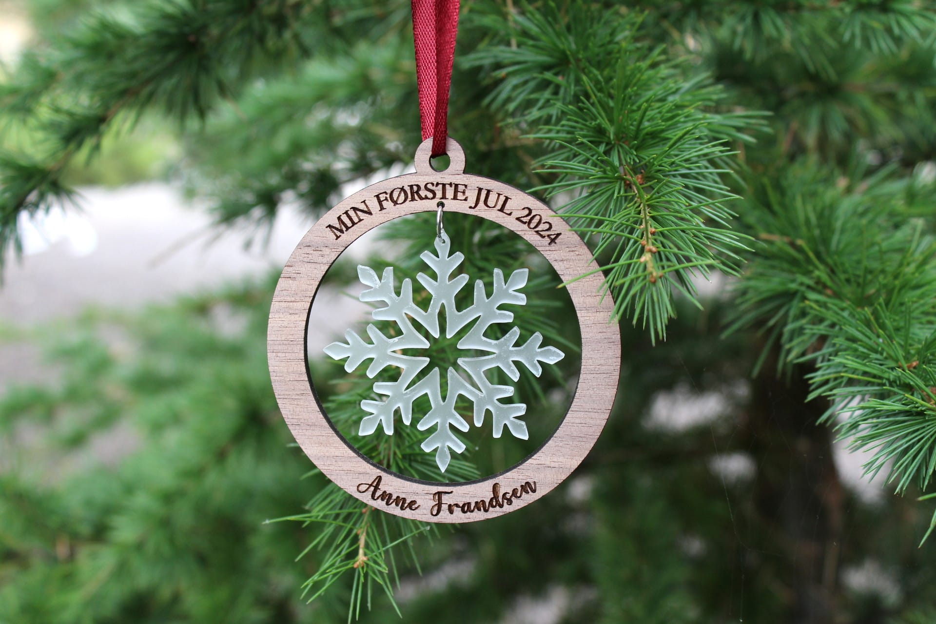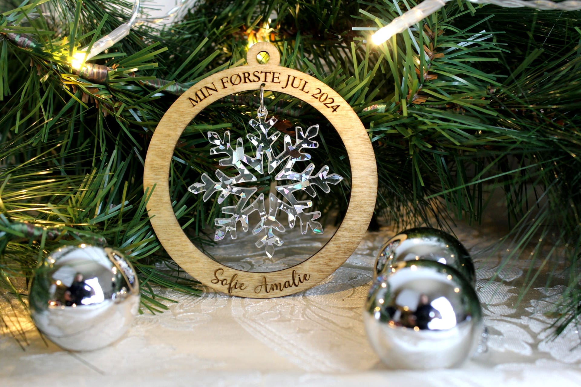 Skab en helt særlig julestemning med et personligt juleornament med iskrystal, der kombinerer elegance og betydning. Dette unikke ornament måler 9 cm i diameter og er designet med en smuk iskrystal i midten. Dette gør det til et iøjnefaldende og meningsfuldt element på ethvert juletræ. Iskrystallen kan vælges i spejlakryl, glimmerakryl eller frosted akryl, hvilket tilføjer et ekstra lag af skønhed og tilpasningsmuligheder. Ornamentet kan personliggøres med navn, citat eller en særlig tekst, hvilket gør det til en ideel gave til et barns første jul eller som en rørende hyldest til nogen, du vil mindes.