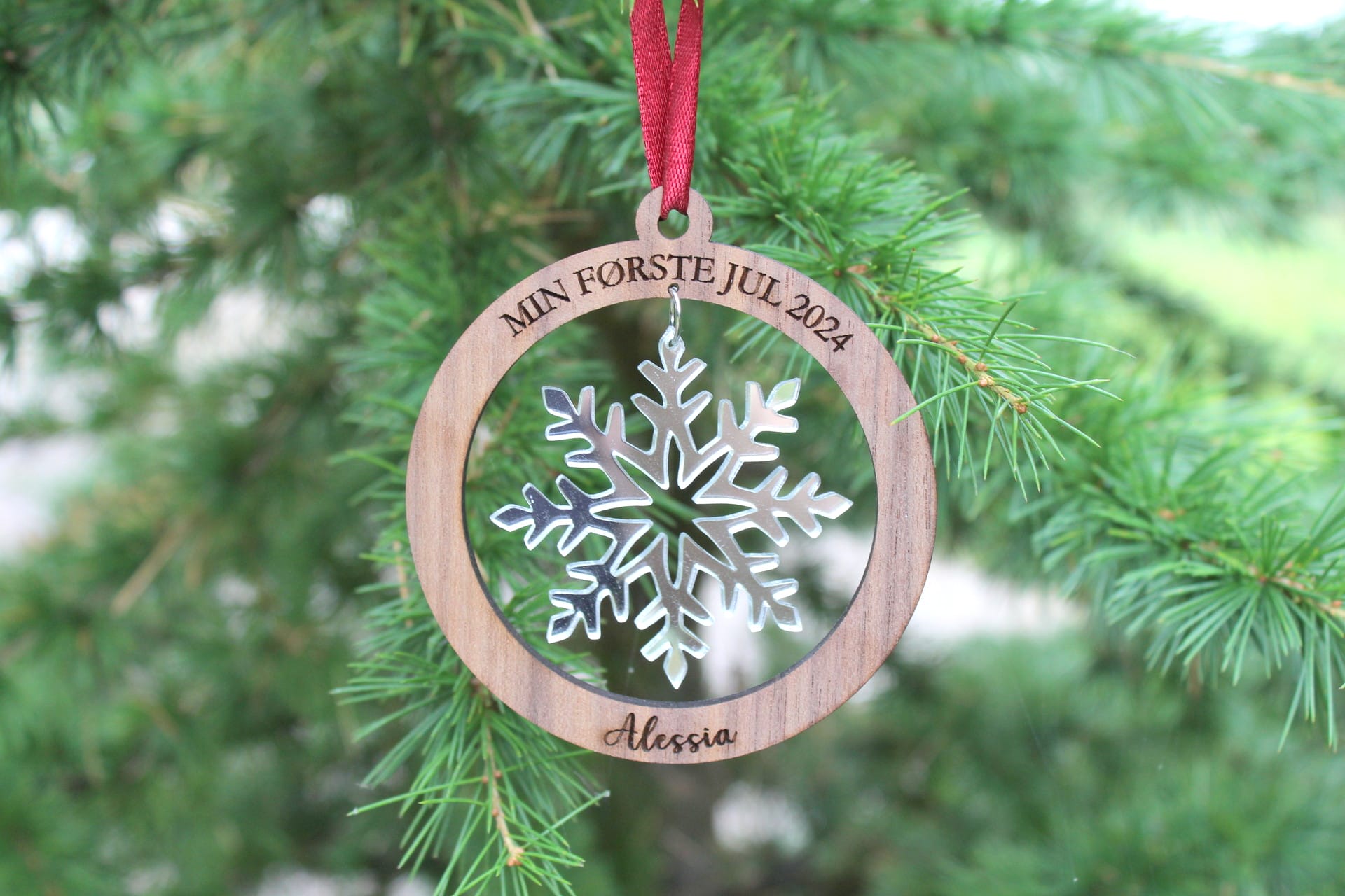 Dette juleornament med navn og personlig tekst er en smuk måde at tilføje en personlig touch til din juleudsmykning på. Uanset om det er til minde om et særligt øjeblik eller en gave til en elsket, vil det håndlavede ornament bringe glæde og varme til din jul i mange år fremover. Med dets kombination af smukt træarbejde og glitrende iskrystal, er dette ornament et elegant og meningsfuldt valg til enhver juletradition.