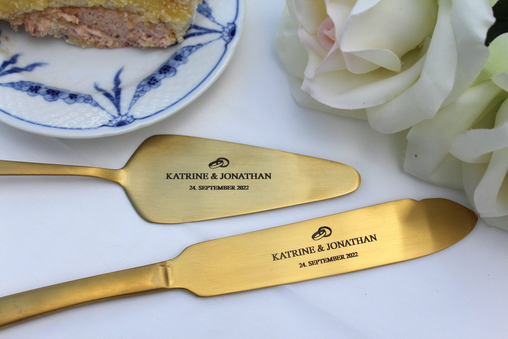 Vores Kagesæt Guldlook – Ringe med personlig indgravering er mere end bare et produkt; det er en følelse, en oplevelse og en hyldest til kærligheden. Med sødmen af kage og elegance af vores kagesæt bliver dine begivenheder transformerede til uforglemmelige minder. Vælg vores kagesæt som en unik gaveidé til bryllupper, jubilæer eller andre specielle begivenheder, og lad kærlighedshistorier blive indgraveret i hjerterne for altid.