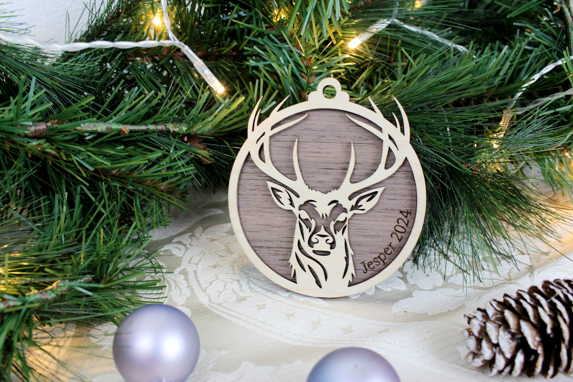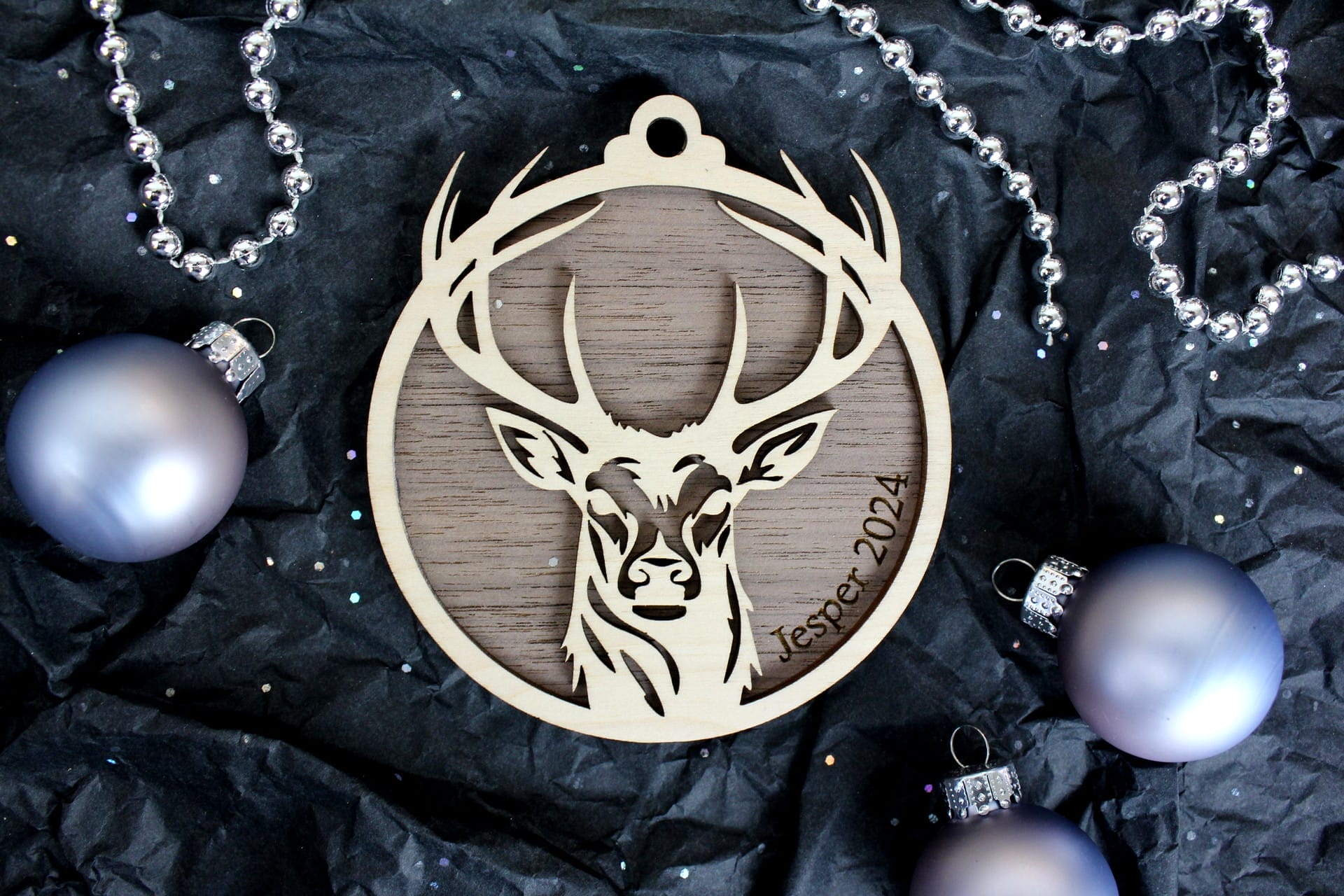 Leder du efter den perfekte julepynt eller gave til jægeren eller friluftsmennesket i dit liv? Vores smukke, personliggjorte juleornament med motiv af en majestætisk kronhjort er præcis, hvad du mangler. Udskåret i birkefiner og monteret på en baggrund af mørk valnød, skaber kombinationen af træsorterne en smuk 3D-effekt, der virkelig får motivet til at træde frem. Den lyse birk står i elegant kontrast til den mørkere valnød, og ornamentet vil stråle på ethvert juletræ.