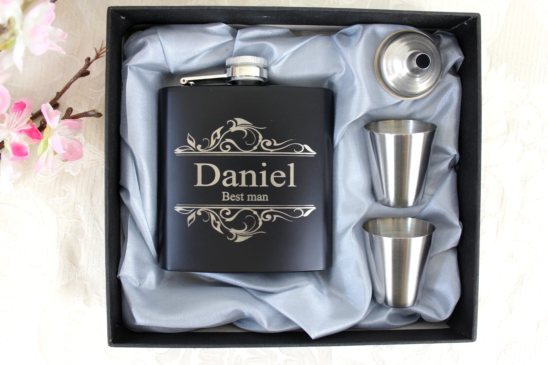 Vores lommelærke med gravering er fremstillet af lakeret rustfrit stål, hvilket giver et eksklusivt udseende og en robust følelse. Hver lommelærke er præcisions laserindgraveret med navn, hvilket sikrer en skarp og præcis indgravering. Lommelærken indeholder 177ml og leveres med to kopper og en tragt, så du nemt kan fylde og dele indholdet.