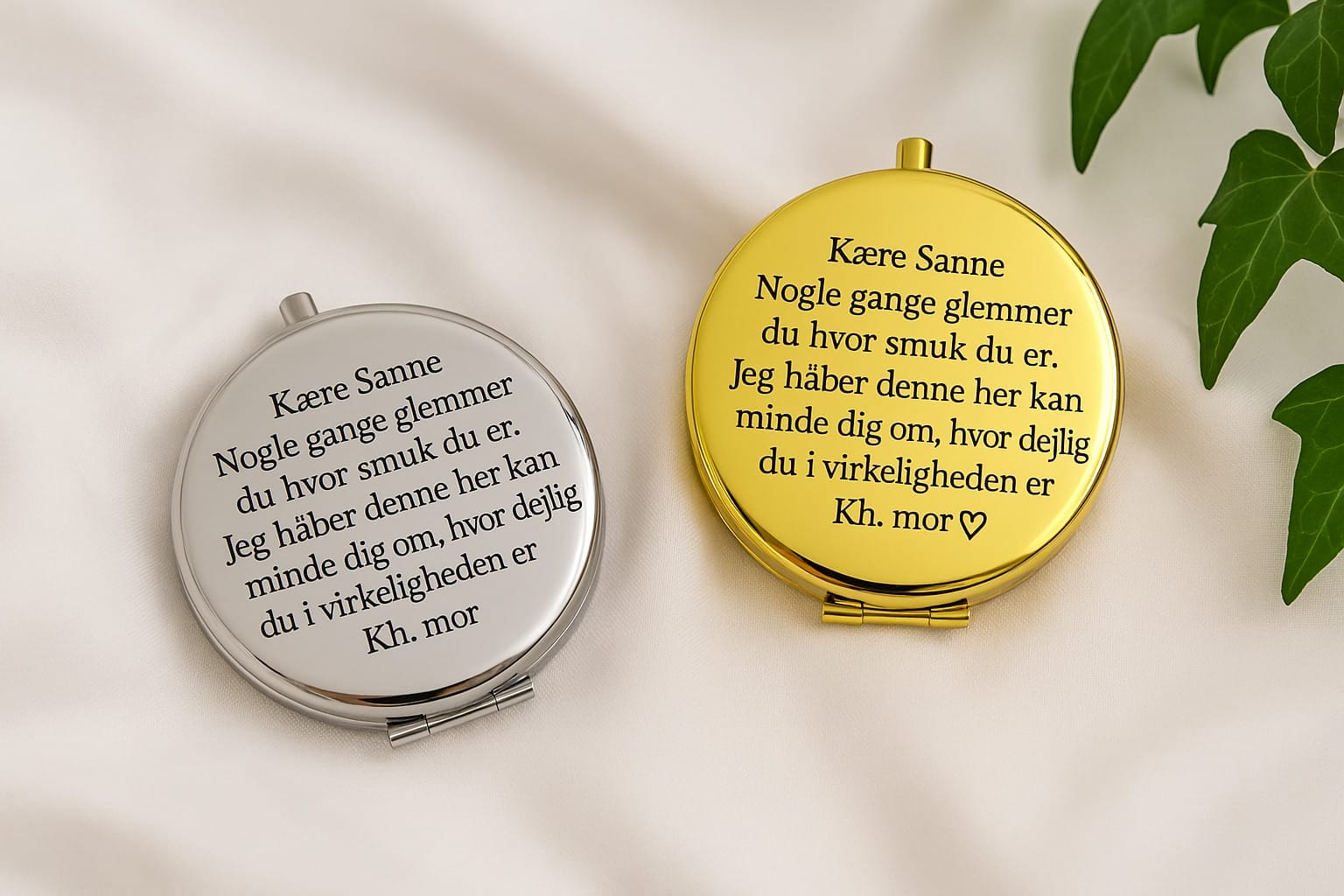 Med Lommespejl – Din egen tekst giver du mere end bare en gave – du giver et lille personligt minde, der kan bæres med hver dag. Det er den perfekte kombination af design, kvalitet og kærlighed.