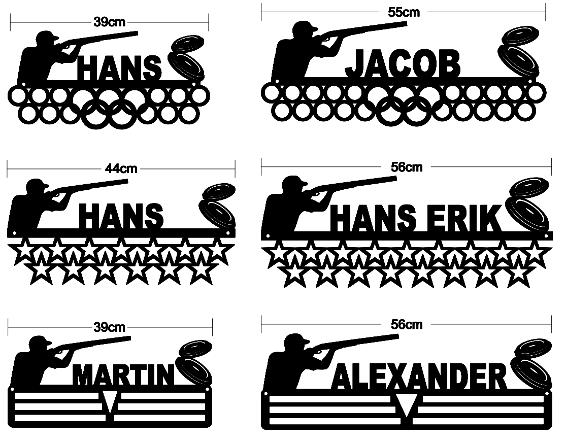 Er du vild med lerdueskydning – eller kender du én, der er? Så er denne personlige medalje holder med motiv af en skeetskytte den helt rigtige måde at vise sine præstationer frem på. Medaljeholderen er lavet i solidt, pulverlakeret stål og designet med en mandlig flugtskyder til venstre og et sæt lerduer i flugt til højre. Mellem de to motiver får du udskåret dit eget navn – som en integreret del af det flotte design.