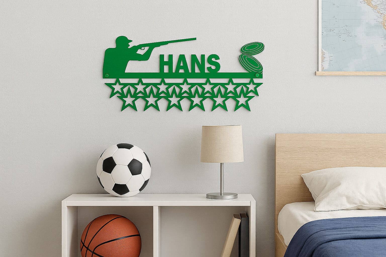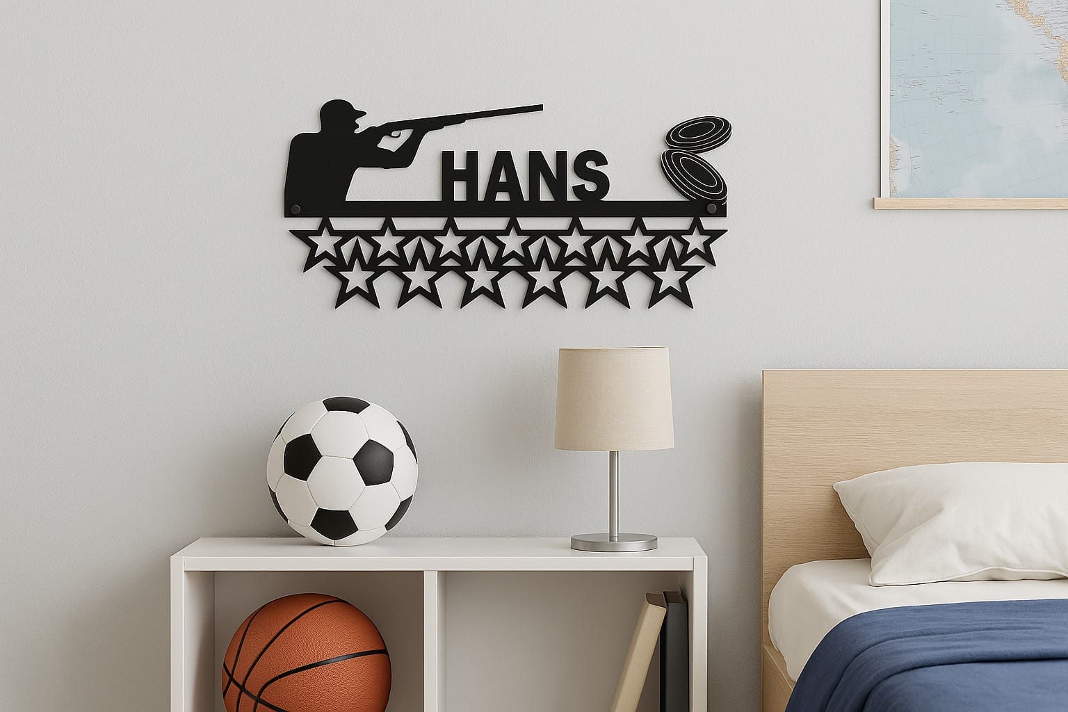 Den er både et praktisk medalje ophæng og en fed dekoration på væggen, der viser din passion for skydesporten. Uanset om den hænger i stuen, trofæværelset eller drengeværelset, er den et stærkt statement og en unik gaveidé til den dedikerede sportsudøver.