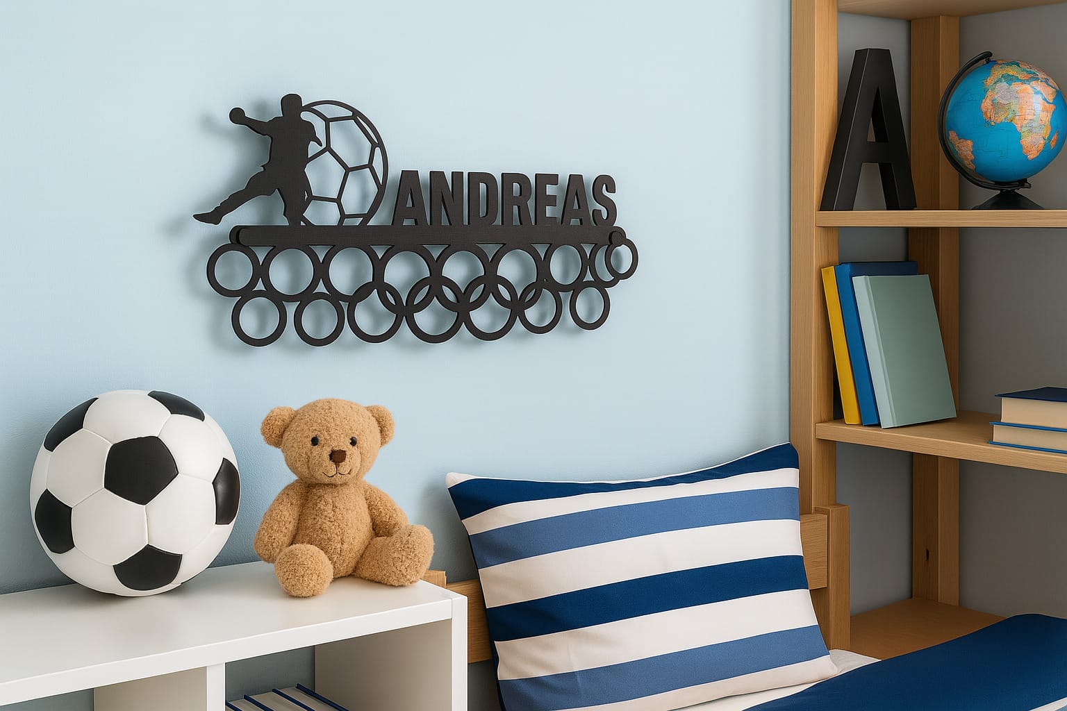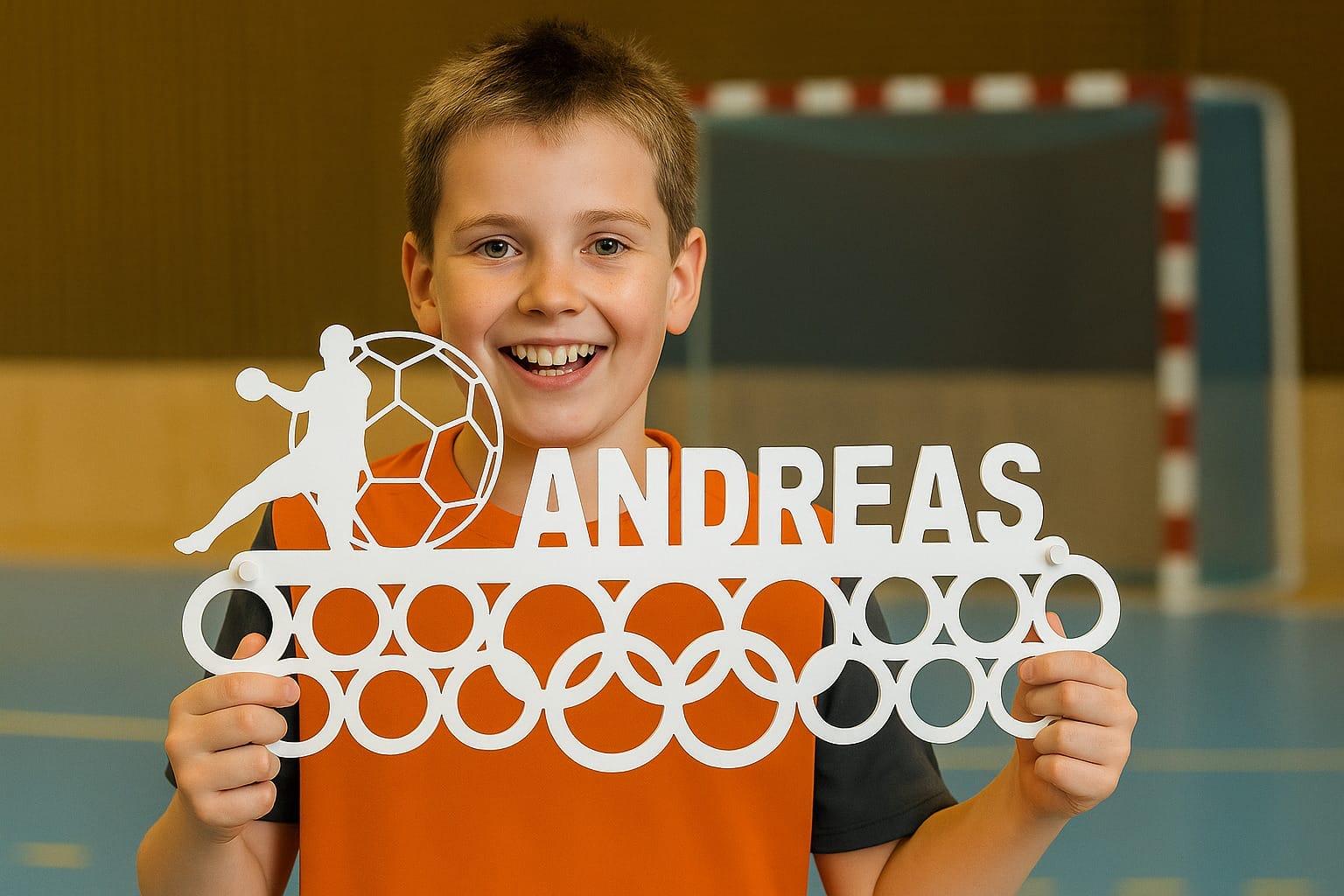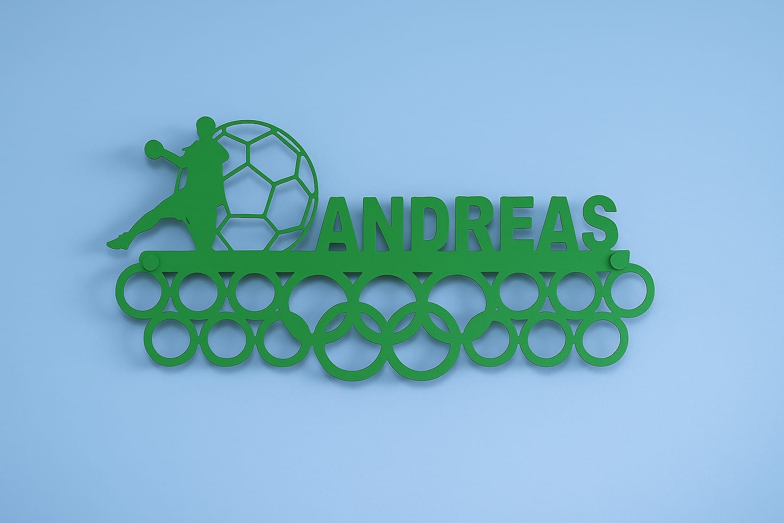 Gør dine sportspræstationer til en del af indretningen med denne unikke personlig medalje holder! Her får du ikke bare en medalje ophæng – du får et stilrent design i pulverlakeret stål, hvor dit navn bliver en integreret del af motivet. Perfekt til både børn og voksne, der elsker håndbold og gerne vil vise deres præstationer frem på en flot og personlig måde.