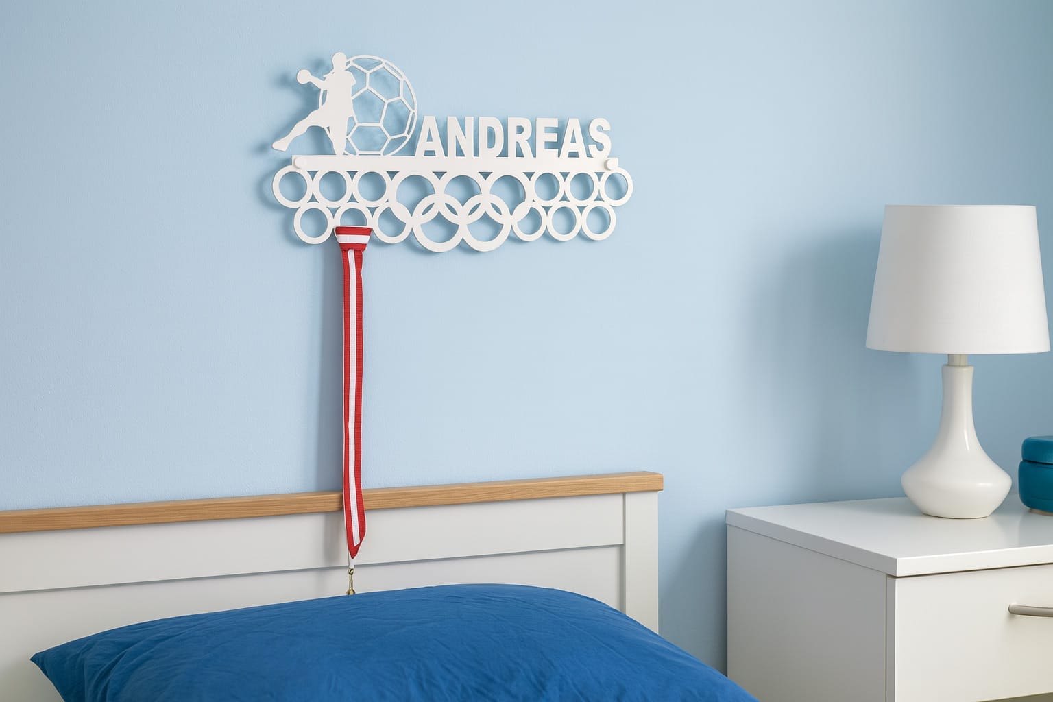 Med motivet af en mandlig håndboldspiller i et dynamisk hopskud og plads til dit navn i store, tydelige bogstaver, bliver denne medalje holder med navn en helt særlig dekoration til væggen – og en super smart løsning til medalje opbevaring.