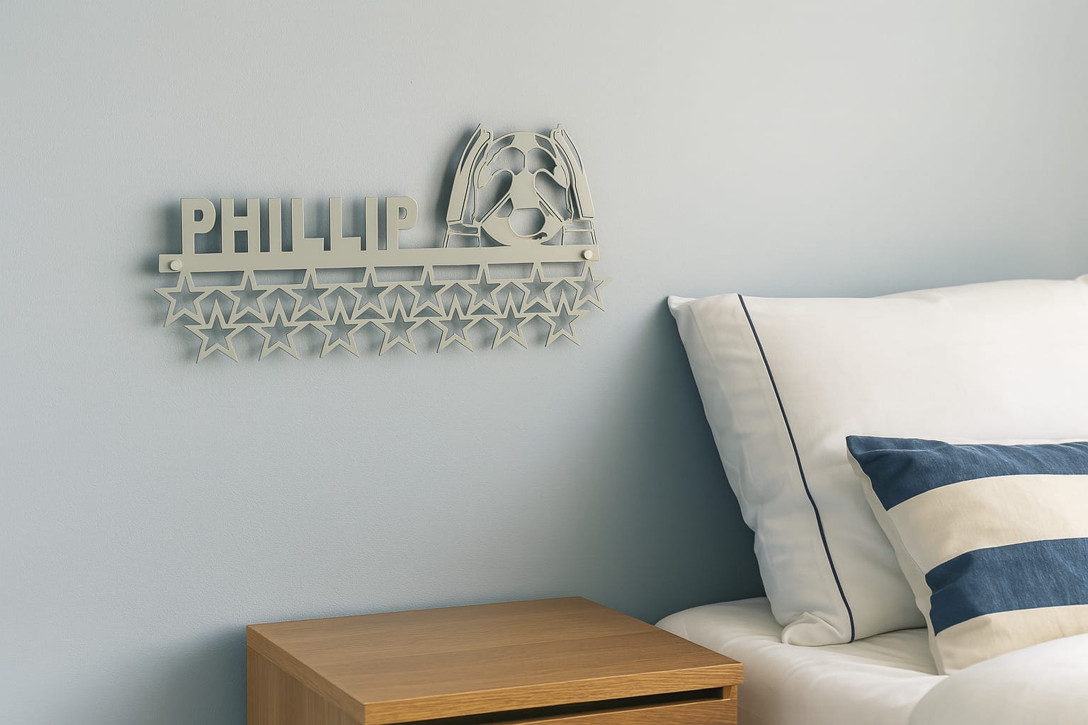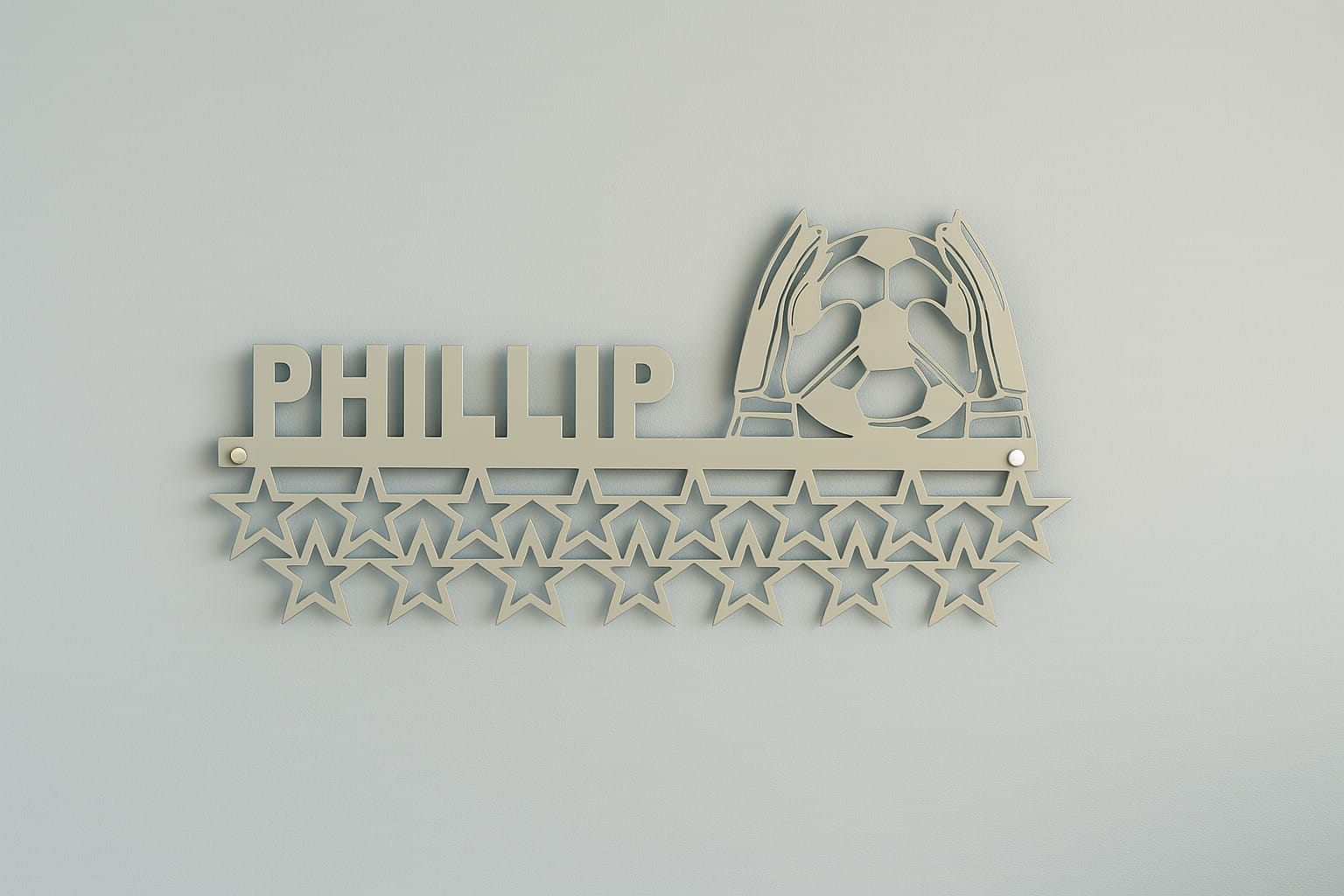 Er du eller dit barn målmand på banen og stolt af dine præstationer? Så er denne personlige medalje holder i stål det perfekte valg! Medaljeholderen kombinerer smart opbevaring med et stilfuldt og sporty design – og den kan gøres helt unik med dit eget navn udskåret i selve metallet.