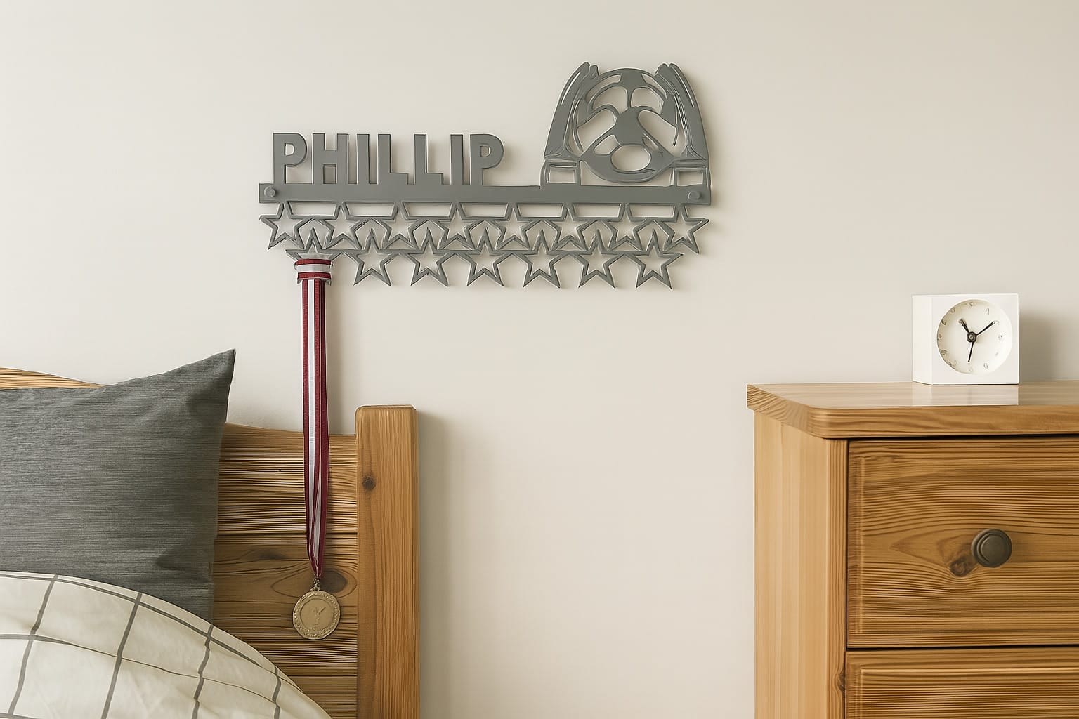 Denne medalje holder med navn er ikke bare funktionel – den er også skabt med tanke på design og boligindretning. Den passer perfekt ind i et moderne hjem, et børneværelse eller sportshjørne og fungerer både som medalje ophæng og dekorativt vægkunst.
