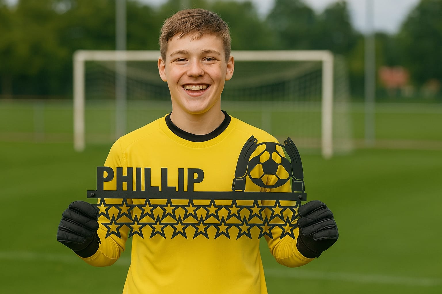 På højre side af holderen ses et dynamisk motiv af et par målmandshandsker, der griber en fodbold – et stærkt symbol på mod og redninger i sidste øjeblik. Til venstre bliver dit navn en integreret del af designet, så du virkelig kan vise, hvem der har kæmpet for hver eneste medalje.