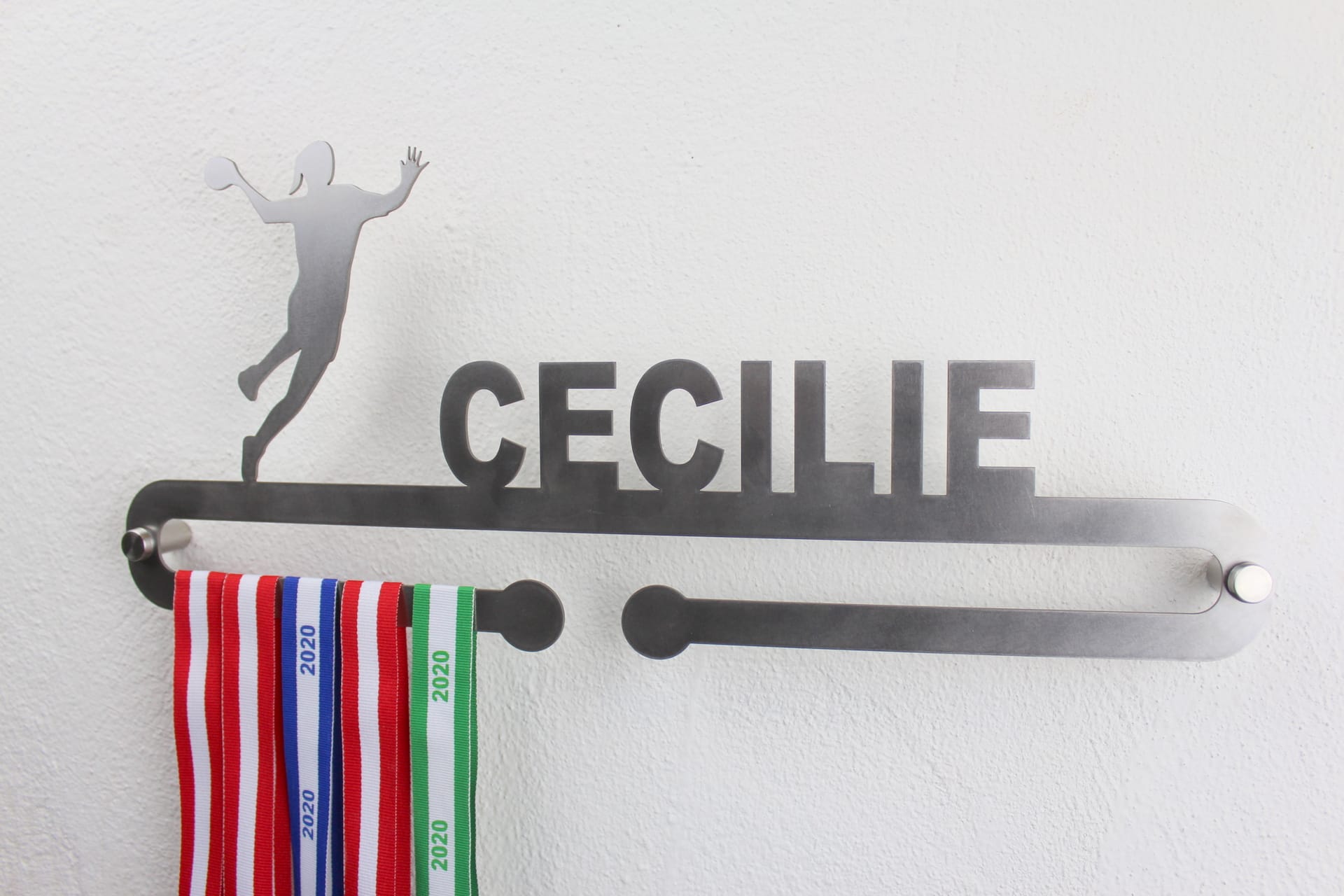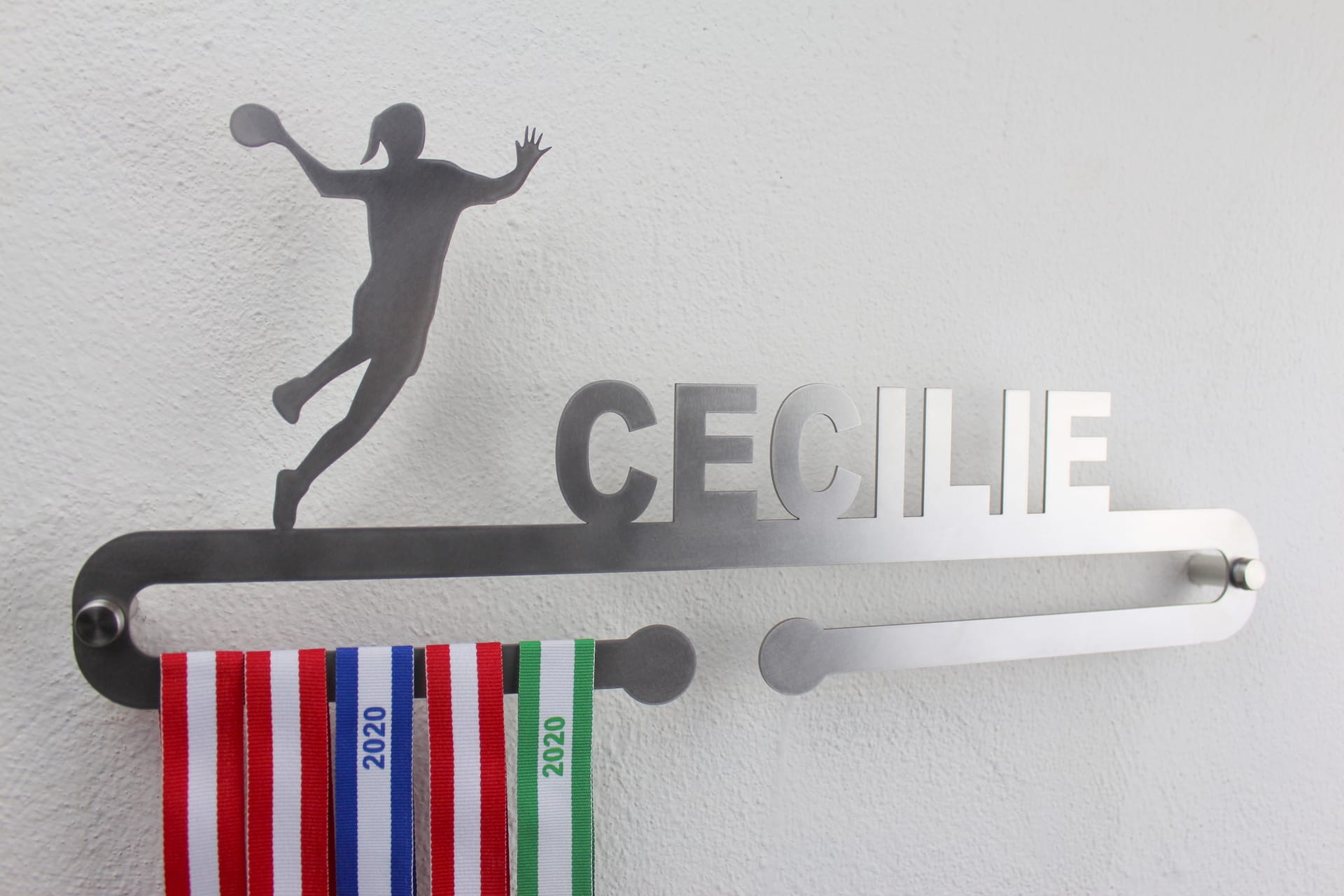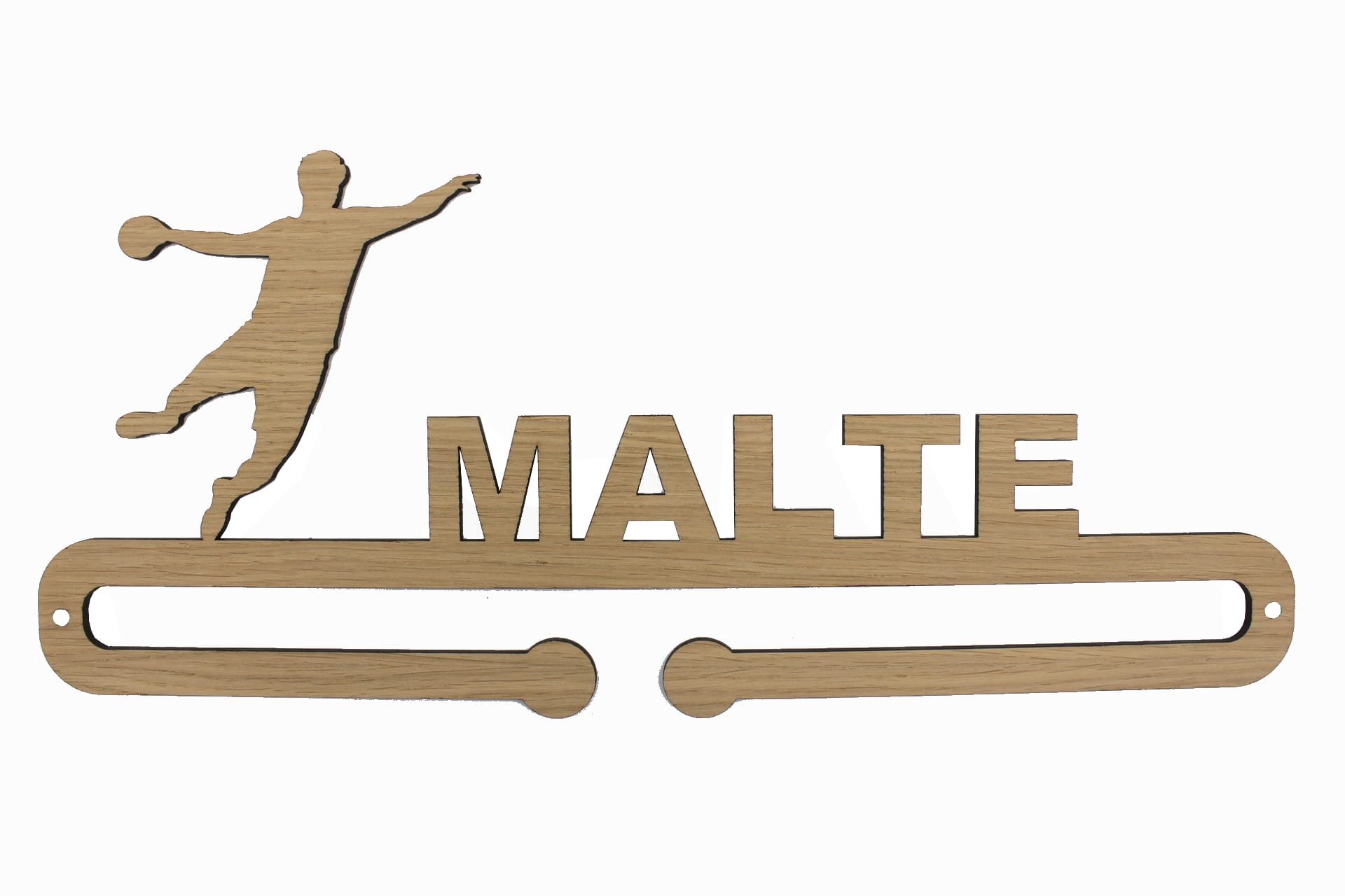 Opbevar og vis dine medaljer med stil med vores personlige medaljeholder med navn og motiv af en håndboldspiller. Vores medaljeholder er tilgængelig i både træ og stål og er skåret med høj præcision for at give en unik og personlig touch til dit hjem.