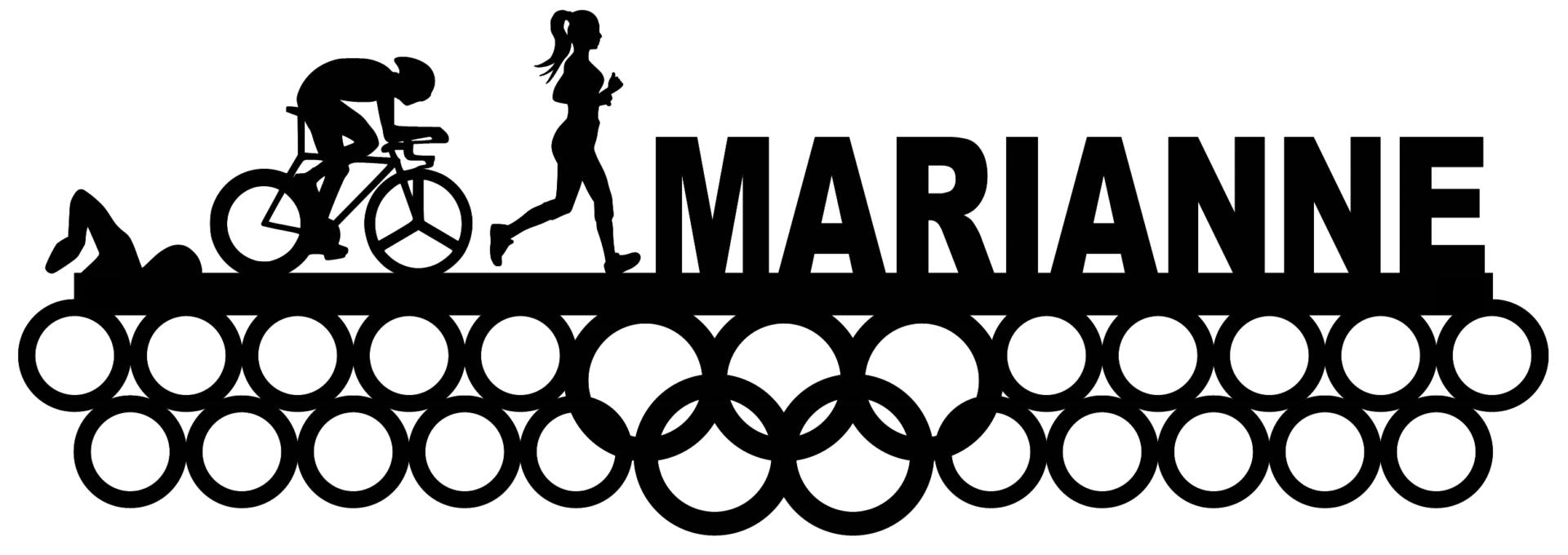 Fejr dine sportslige præstationer med en personlig medalje holder i stål, designet til triatleter, der ønsker at kombinere funktionalitet med flot sportsdesign. Denne medaljeholder har et detaljeret motiv af en kvinde, der svømmer, cykler og løber – tre discipliner samlet i ét unikt udtryk. Til højre i designet udskæres dit navn med præcision, så din medalje holder med navn bliver helt personlig.