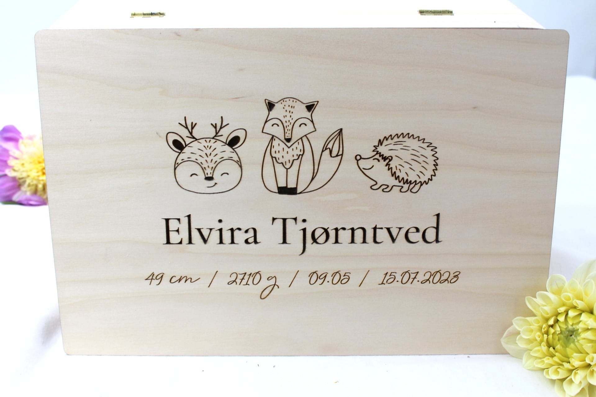 Hver memorybox er omhyggeligt håndlavet med detaljerede graveringer af skovens dyr – en lille hjort, ræv og et pindsvin. Disse skønne motiver gør kassen ekstra personlig og er en perfekt gaveidé til barnedåb. Graveringen tilføjer et unikt touch, der gør mindekassen til et varigt og personligt minde.