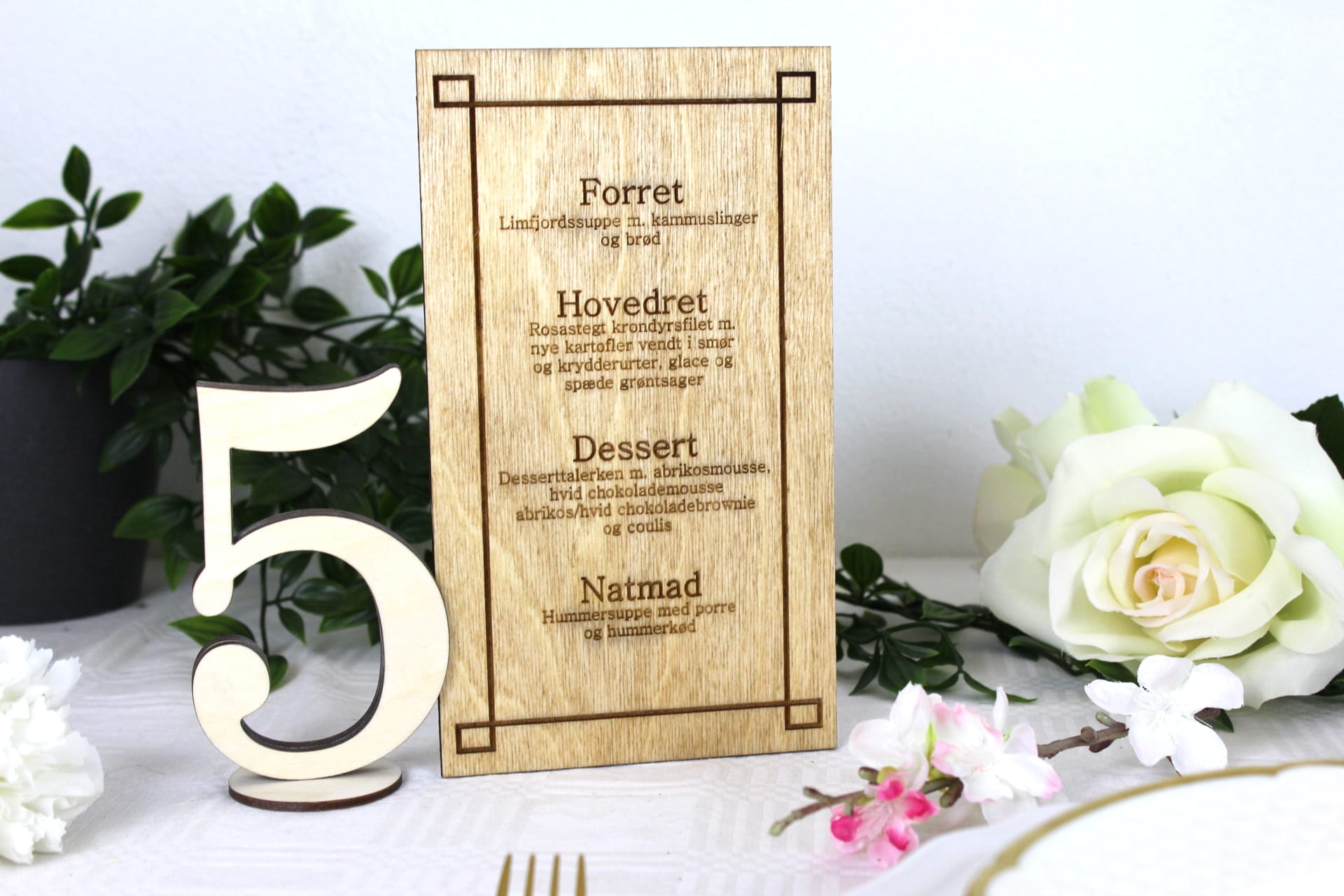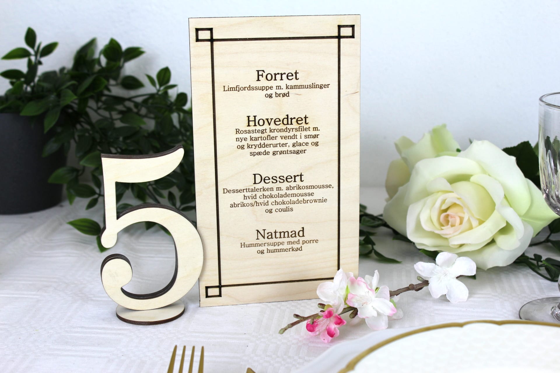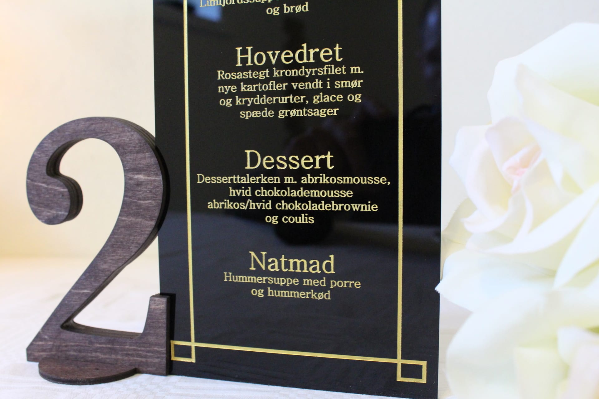 Fås i både træ og akryl. Vælg mellem fod i samme farve som selve menukortet eller et bordnummer der passer til menuen i enten mørk eller lys farve.