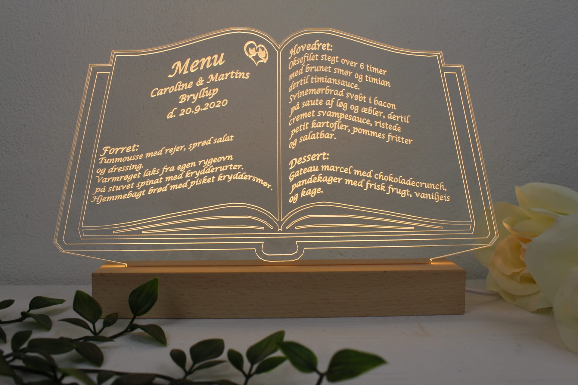 Menukortet er lavet i akryl og oplyst af en LED base i træ.