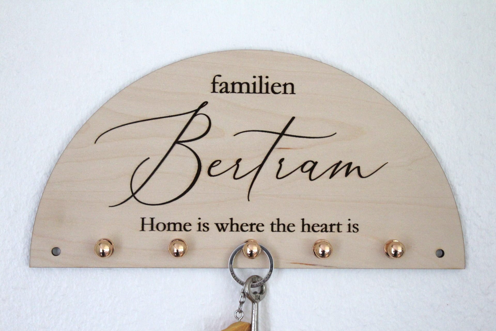 Gør din nøgleholder endnu mere personlig ved at tilføje dit familienavn og et lille citat, der beskriver din families værdier eller livsfilosofi. Denne funktion gør nøgleholderen til en meningsfuld og unik del af dit hjem, der afspejler jeres personlighed og historie. Uanset om du vælger et klassisk citat eller en intern joke, vil det bringe et smil frem hver gang du hænger dine nøgler op.