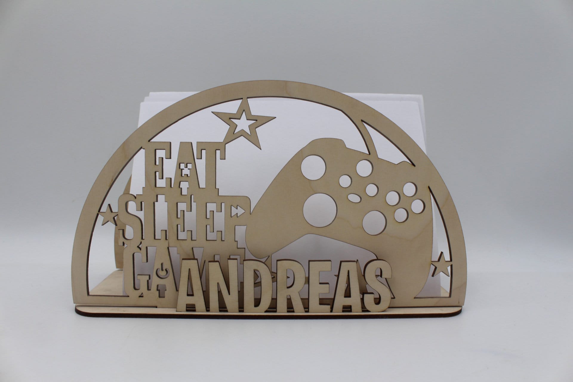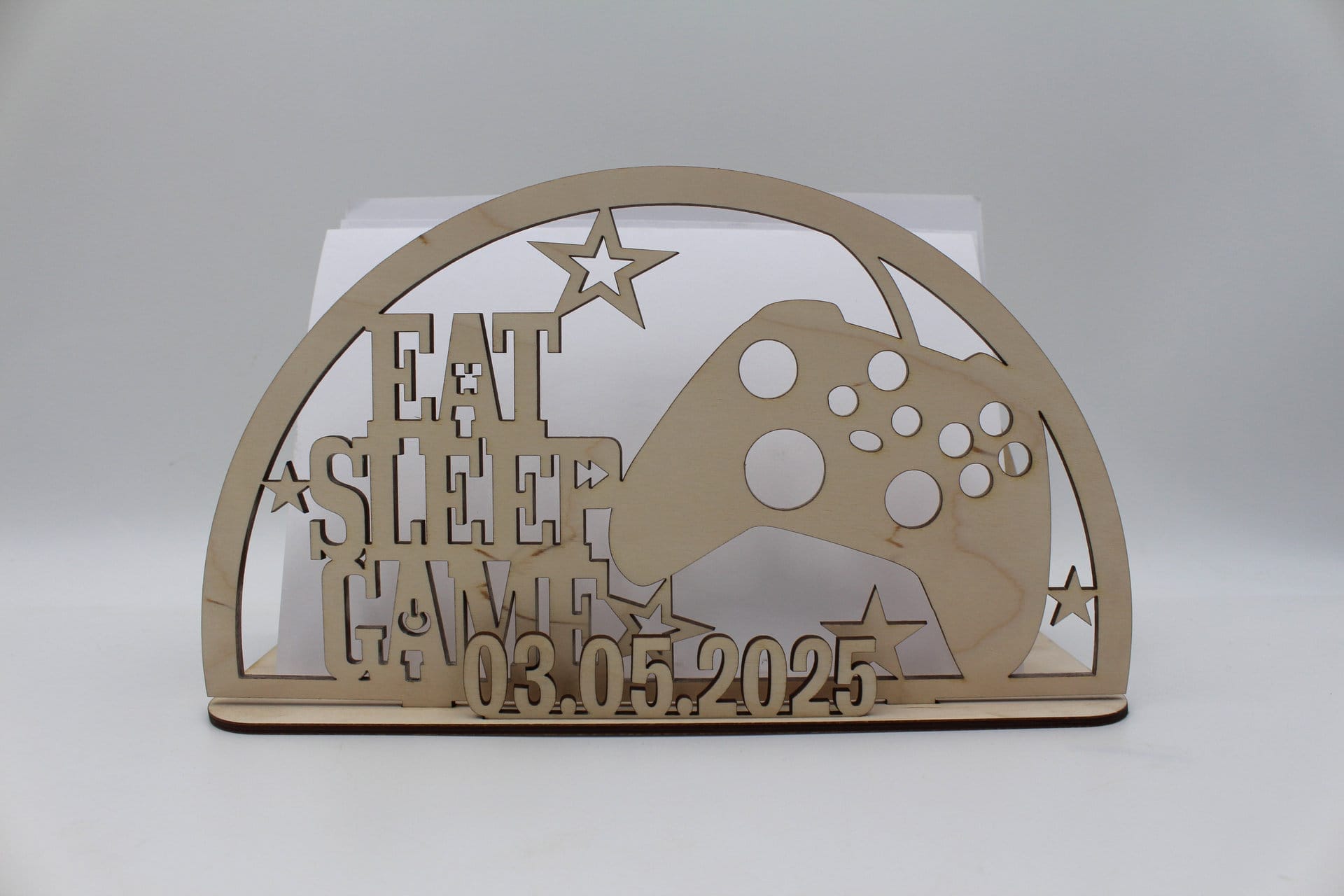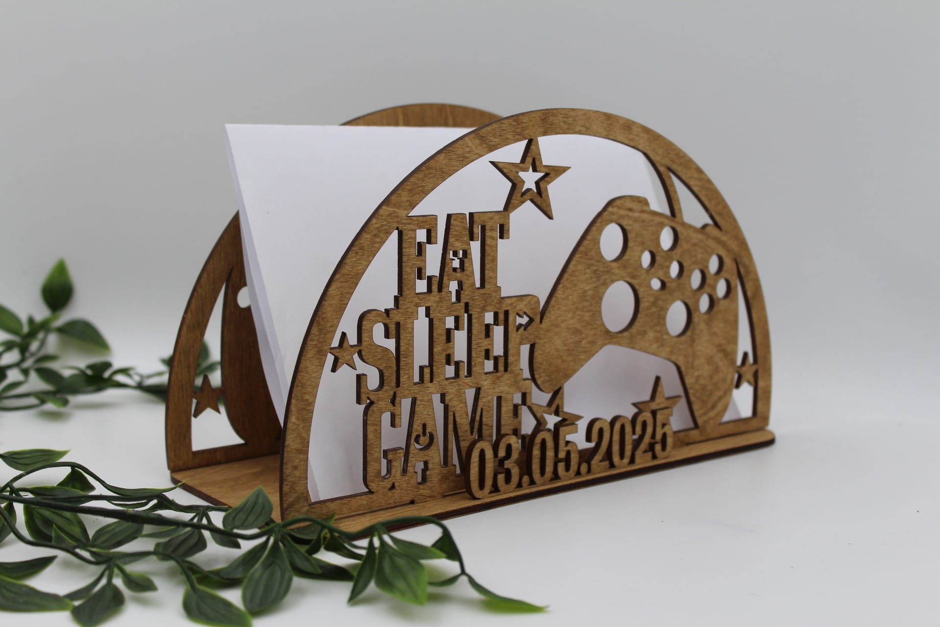 Er du på jagt efter en personlig og unik gave til en gamer? Vores sangskjuler i træ med gaming tema er den ideelle gave til både unge og voksne, der elsker gaming og computerspil. Med et detaljeret motiv af en controller og det populære citat “EAT, SLEEP, GAME”, fanger sangskjuleren essensen af gamer-livet på en kreativ og personlig måde. Denne smukke sangskjuler vil både pynte på bordet under festlige lejligheder og senere blive en fin dekoration på værelset.